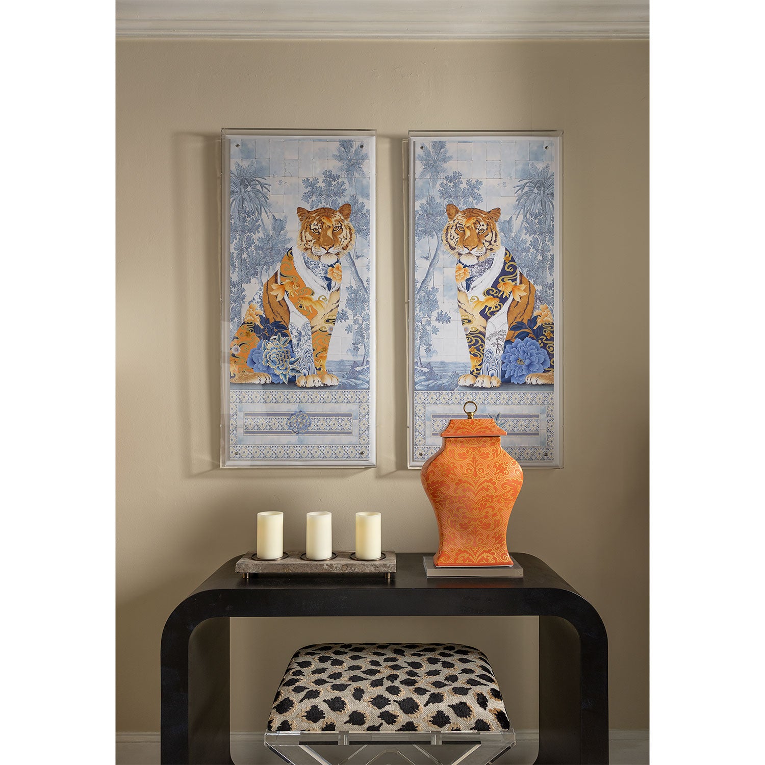 The Tiger panels are a dramatic and colorful pair of giclee prints mounted under a 2.5" deep lucite shadow box. Attached to a linen wrapped interior panel, the artwork is finished with nickel nail head in each corner.