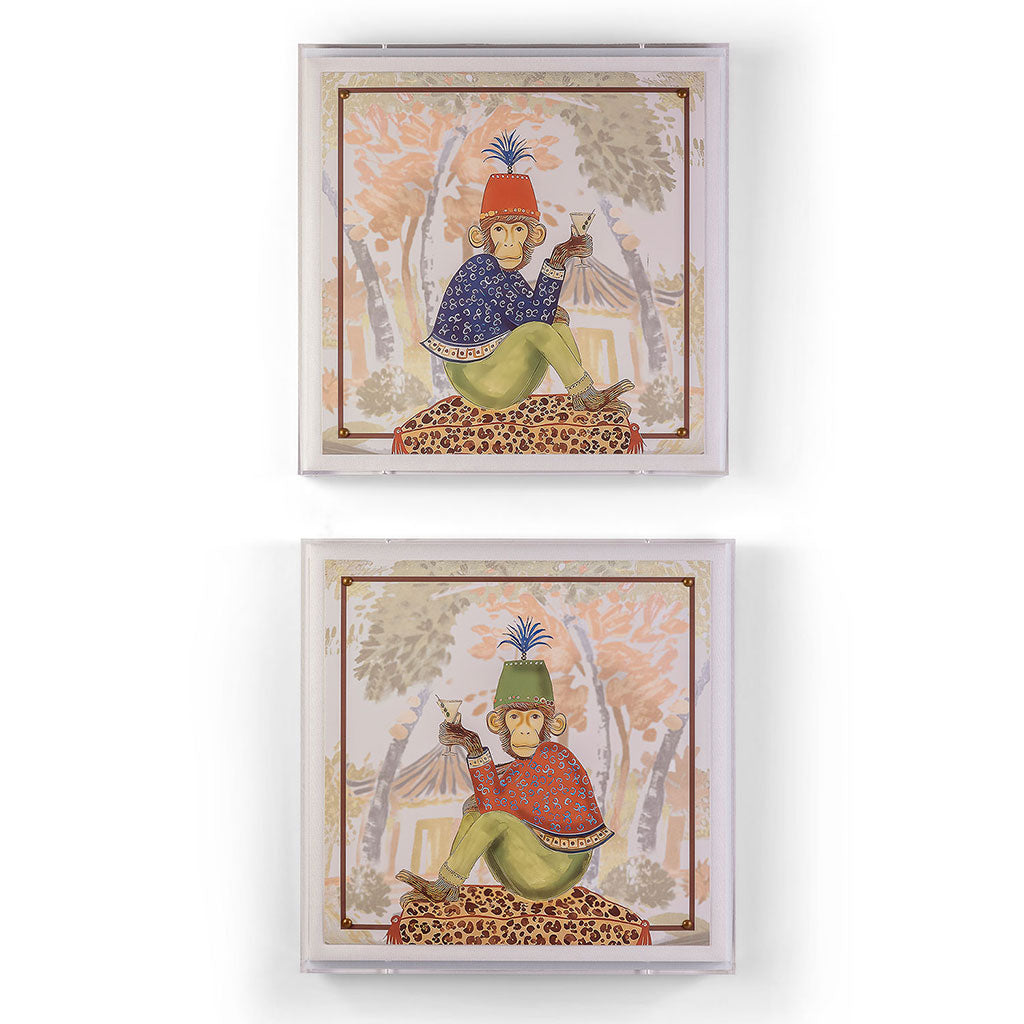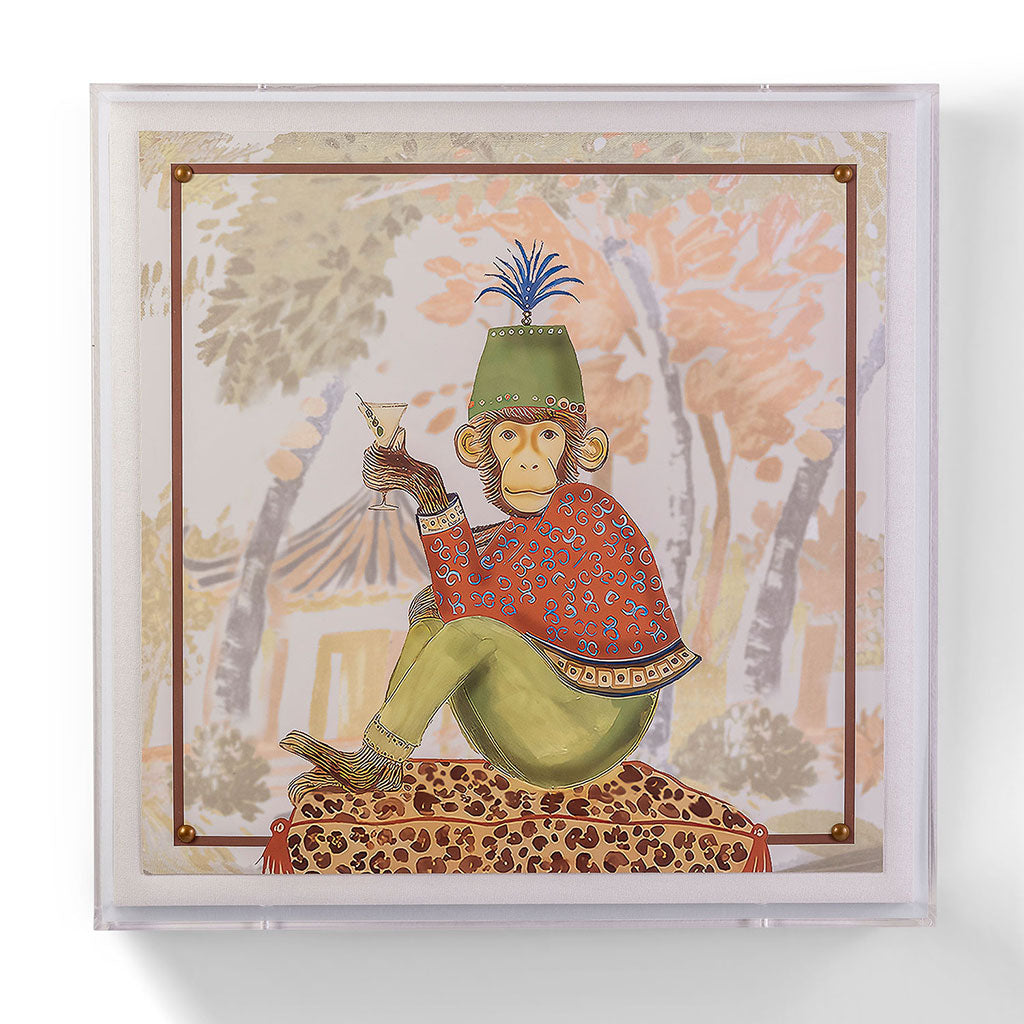 The Martini Monkeys are a fun pair of giclee prints mounted under a 2.5" deep lucite shadow box. Attached to a linen wrapped interior panel, the artwork is finished with aged brass nail head in each corner.