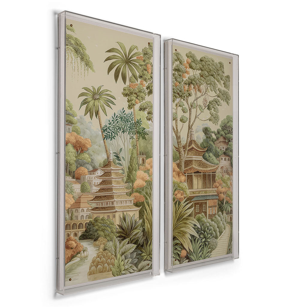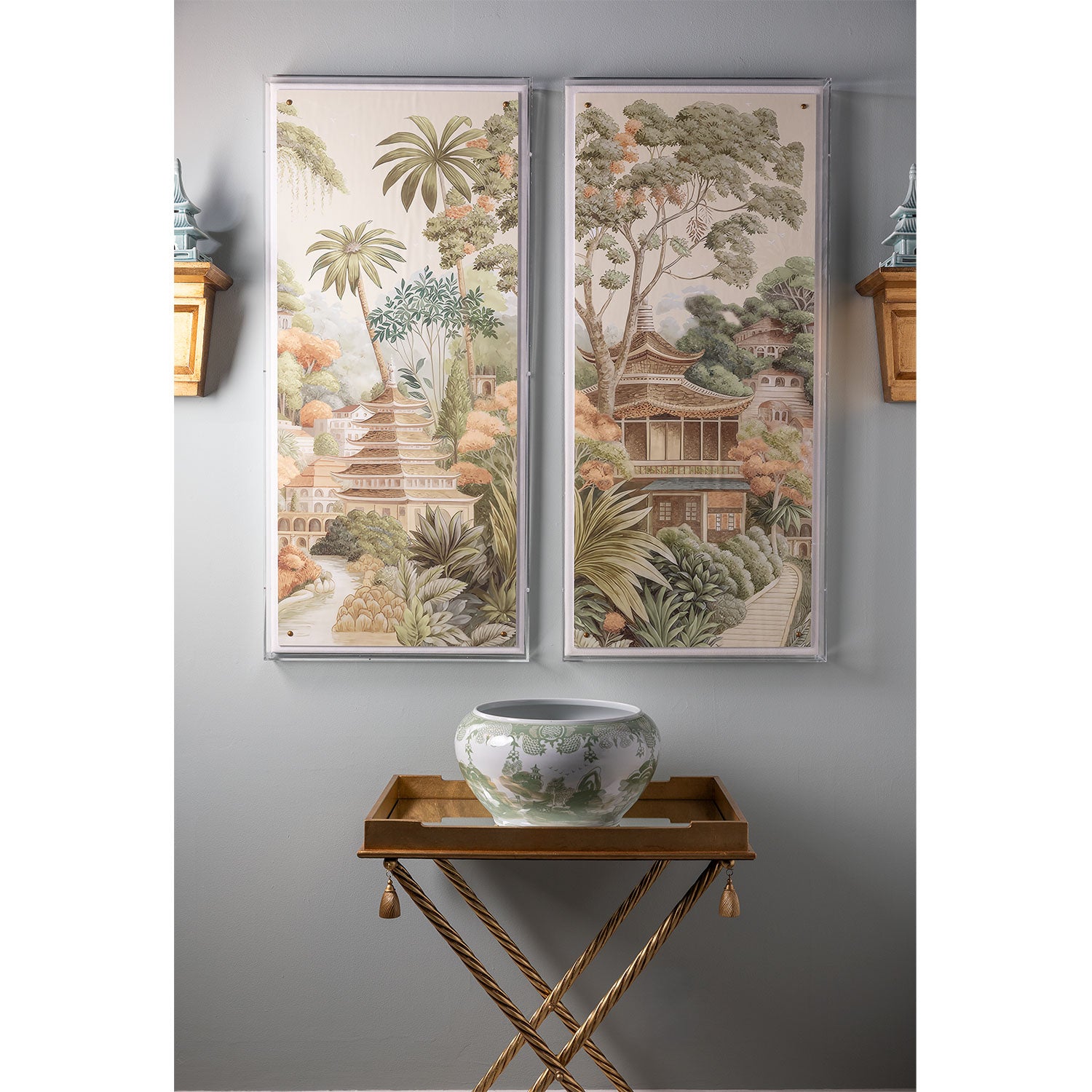 The Tea House panels are a tranquil and colorful pair of giclee prints mounted under a 2.5" deep lucite shadow box. Attached to a linen wrapped interior panel, the artwork is finished with aged brass nail head in each corner.