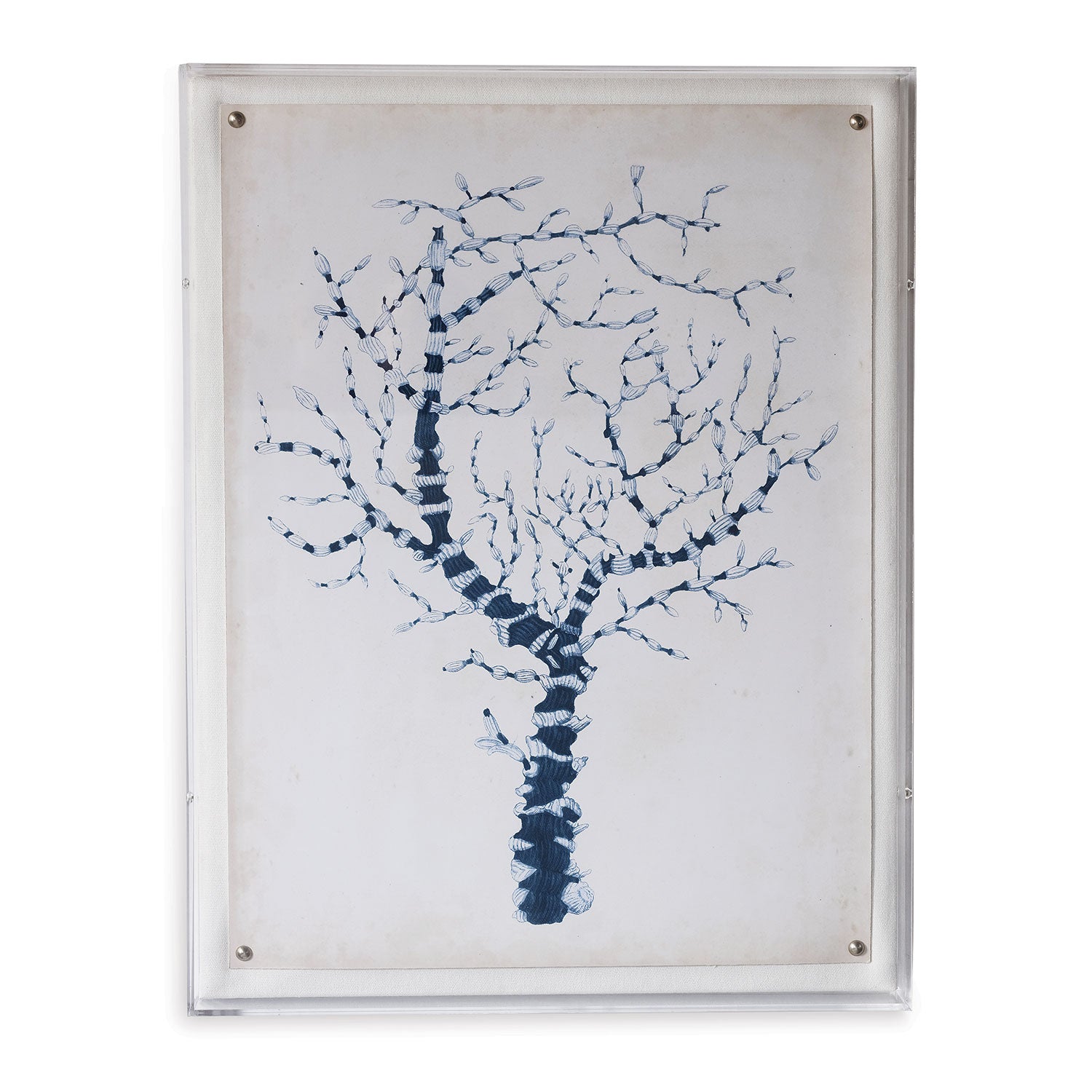 Our artwork collection features a giclee print mounted under a 2.5" deep lucite shadow box. Attached to a linen wrapped interior panel, the artwork is finished with black nail head in each corner.