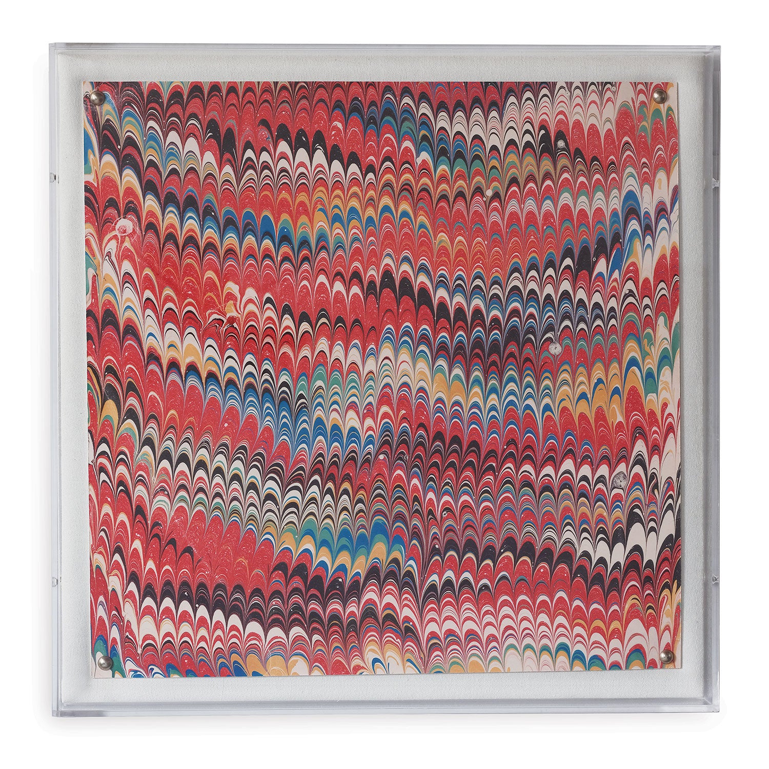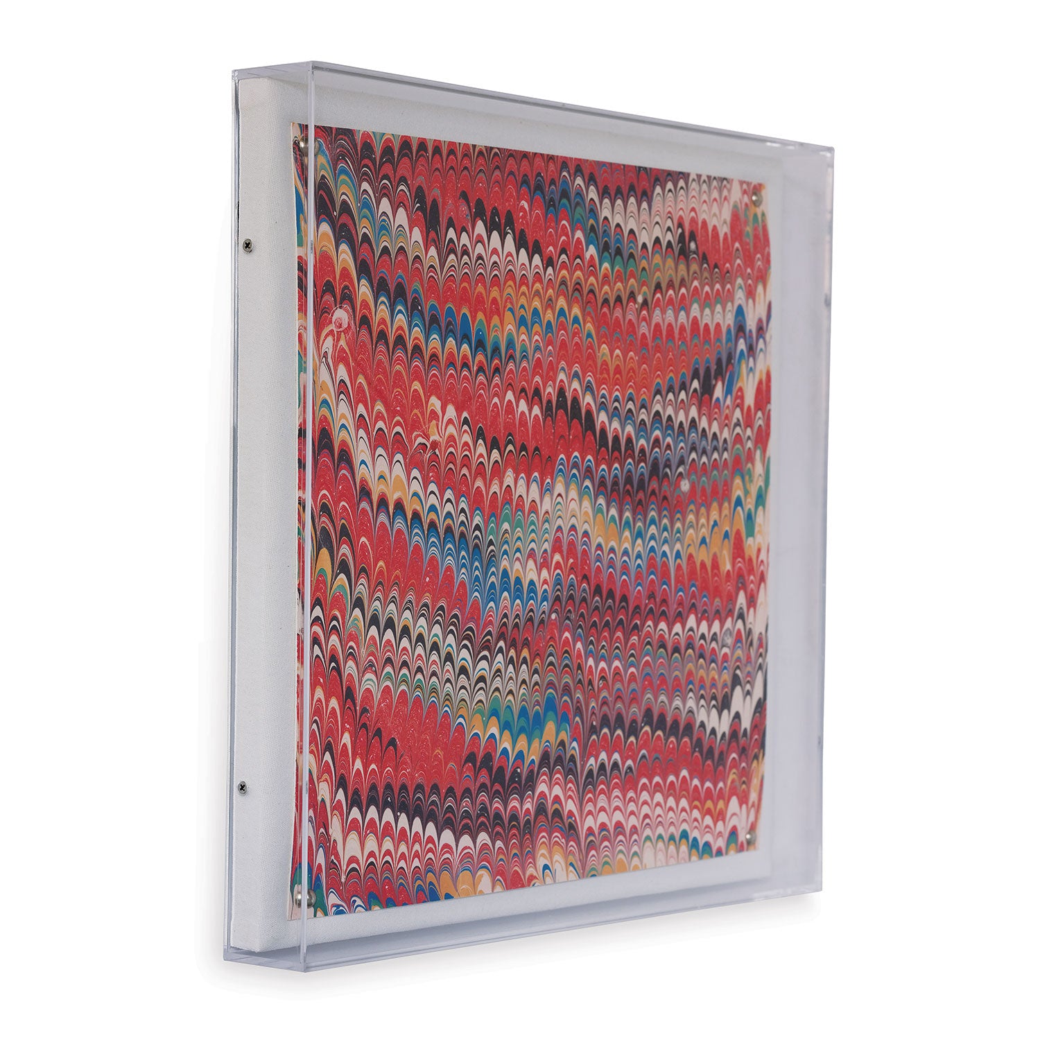 Our artwork collection features a giclee print mounted under a 2.5" deep lucite shadow box. Attached to a linen wrapped interior panel, the artwork is finished with brushed silver nail head in each corner.