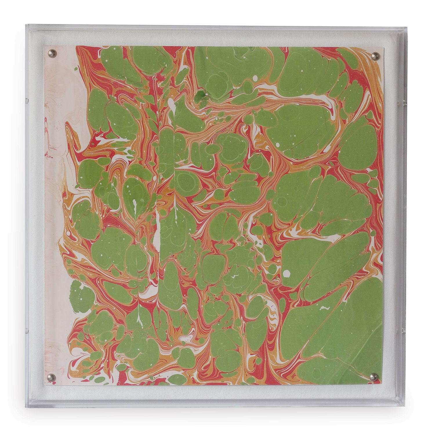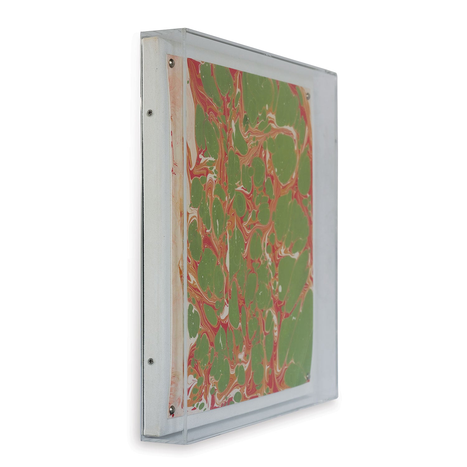 Our artwork collection features a giclee print mounted under a 2.5" deep lucite shadow box. Attached to a linen wrapped interior panel, the artwork is finished with brushed silver nail head in each corner.