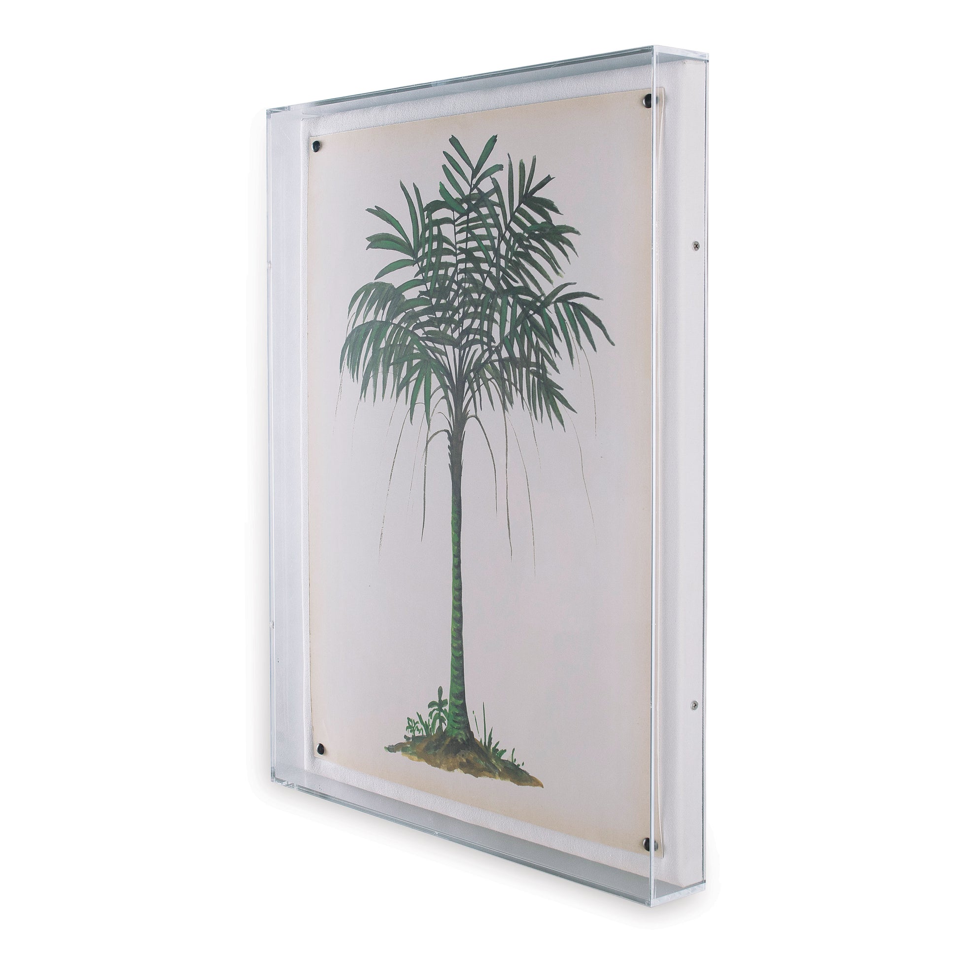 Our artwork collection is mounted under a 2.5" deep lucite shadow box. Attached to a linen wrapped interior panel, the foil finished original artwork is finished with black nail head in each corner.