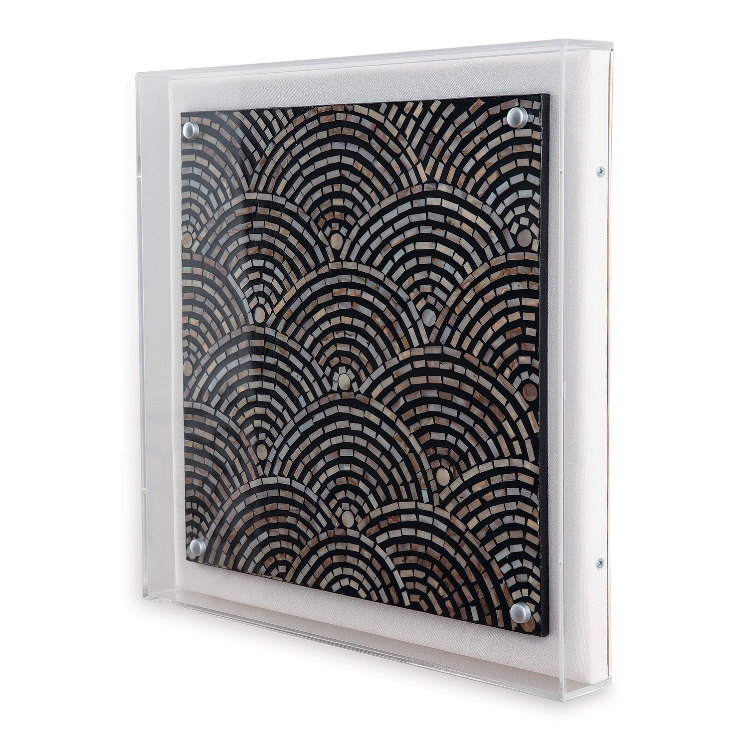Our Wave Panel features hand finished and lacquered mother of pearl veneer on wood. The mother of pearl panel is attached to a linen wrapped upholstered interior board and mounted under our 2.5" deep lucite shadow box frame. The Wave panel is finished with a silver nail head detail in each corner.