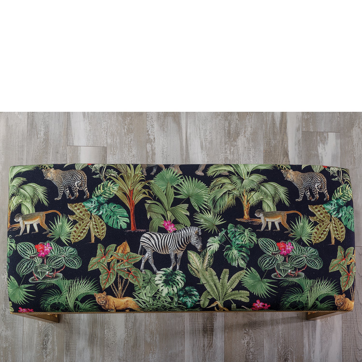 The medallion double bench kit is shown with our Safari fabric with a centered zebra in the middle of the seat cushion top. The bench includes a gold trim cording for a finishing touch.