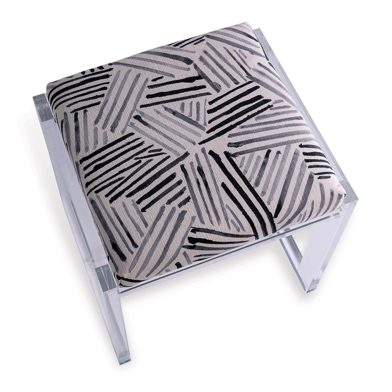 Glencoe is our clear lucite bench which we offer in fabric called Giacometti + an assortment of additional fabrics. The bench is also available in COM with your own fabric for a truly custom application.