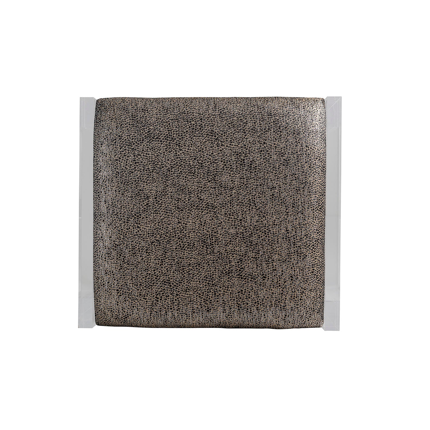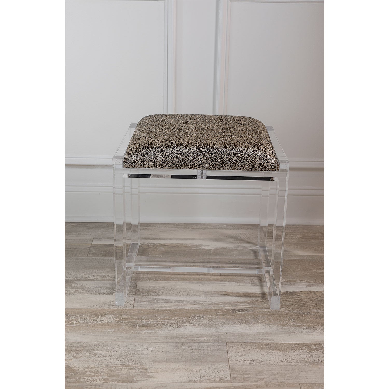 Glencoe is our clear lucite bench which is upholstered in Roxanne. The fabric is a reflective silver/black texture that just shimmers and shines! Very glam.