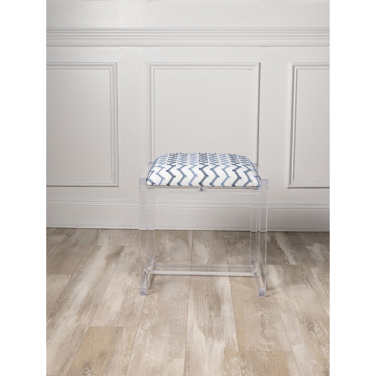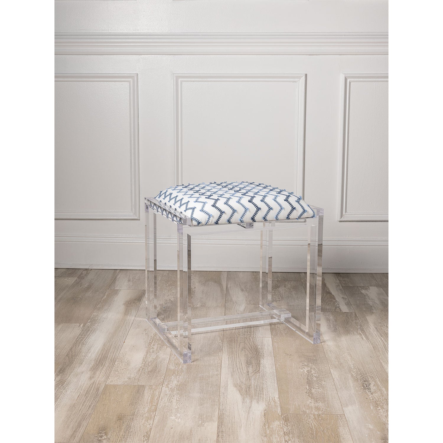 Glencoe is our clear lucite bench which is upholstered in a fabric called Mozzi. The fabric has an eyelash detail in blue on a white ground.