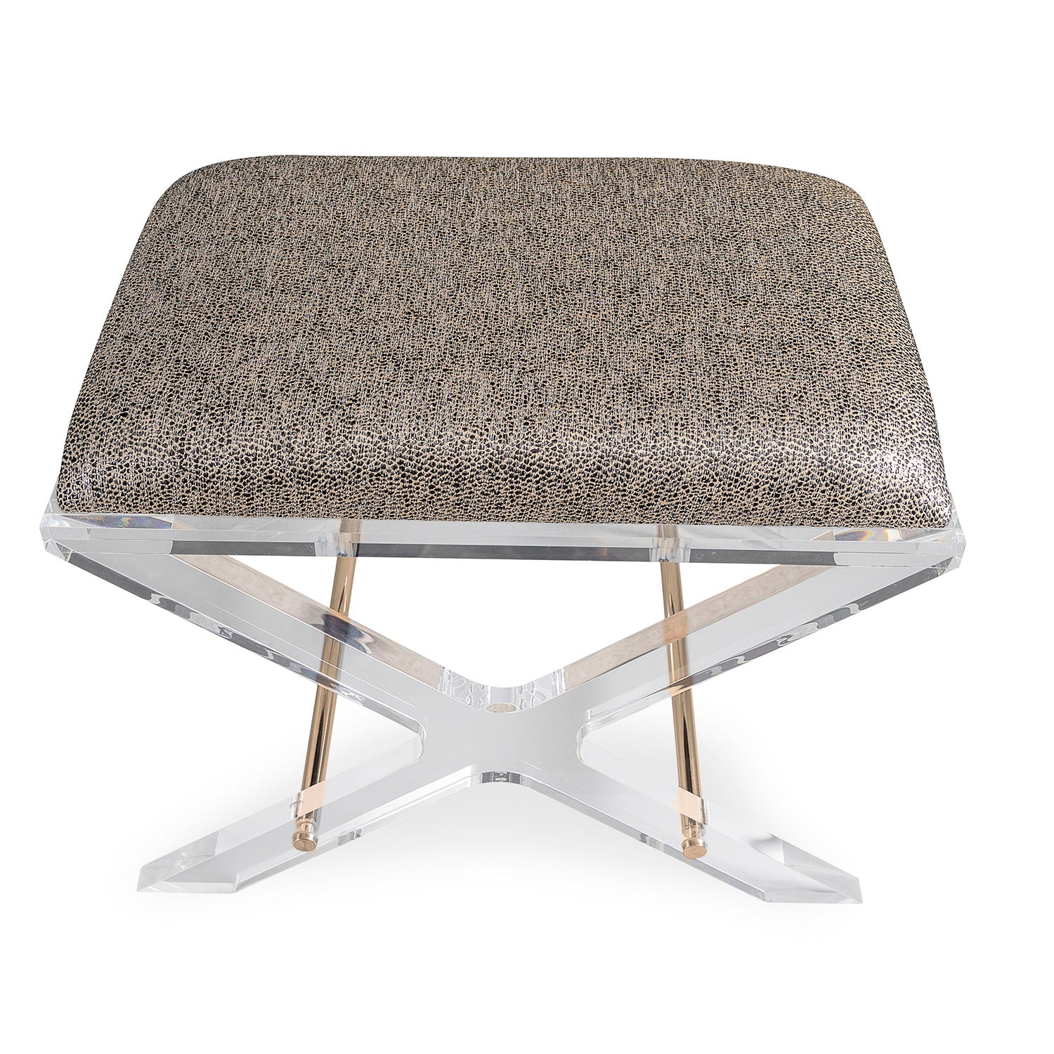 Uber chic clear lucite X shaped accent upholstery--our Delano Bench is the perfect vanity stool and/or designer accent bench in front of the cocktail table or console. Accented with polished gold stretcher bars.