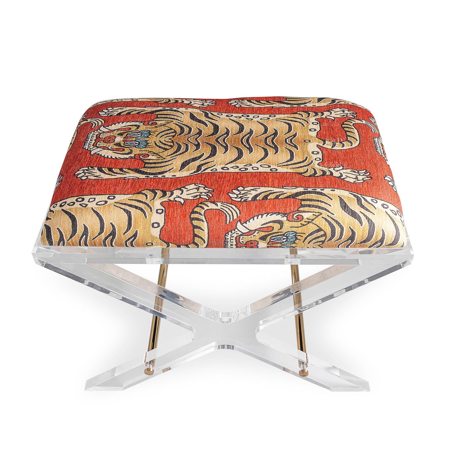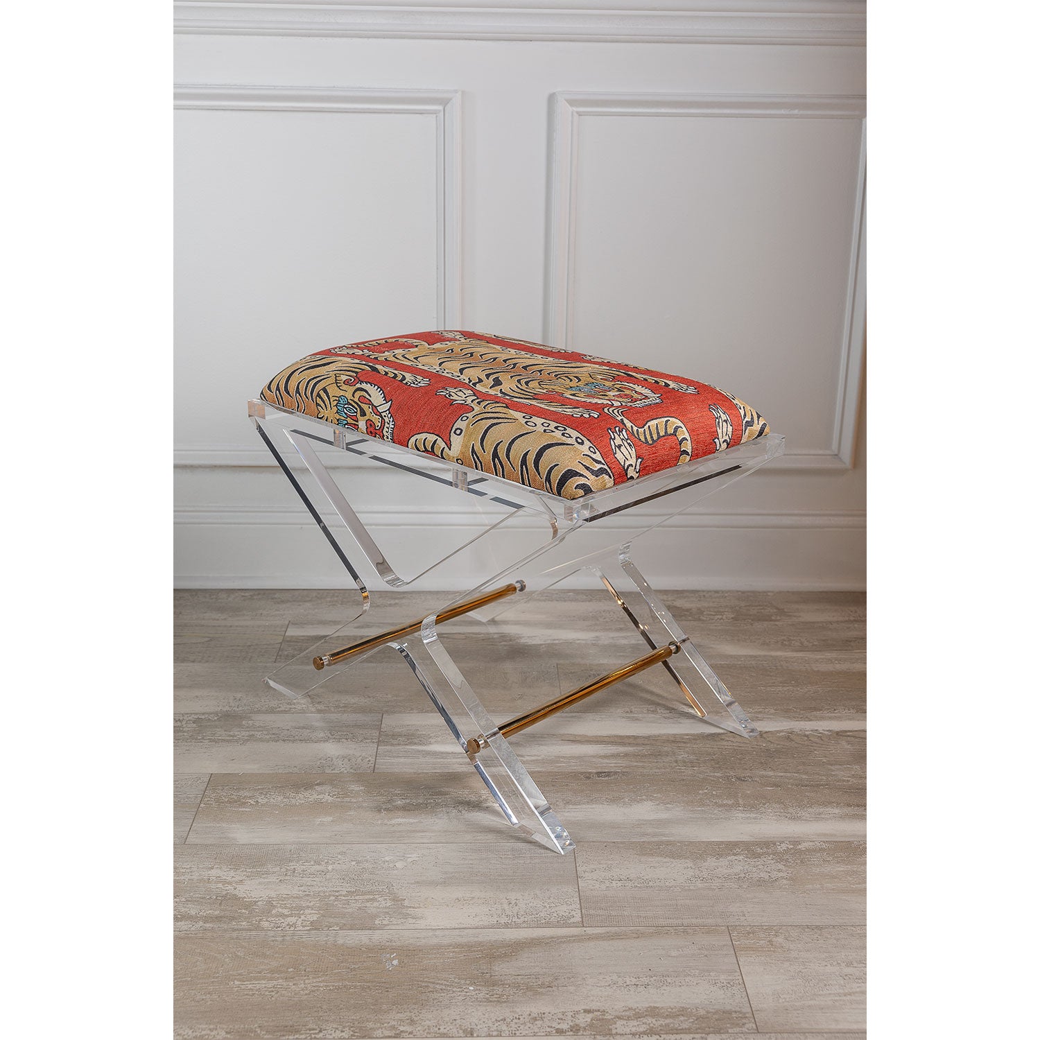 Uber chic clear lucite X shaped accent upholstery--our Delano Bench is the perfect vanity stool and/or designer accent bench in front of the cocktail table or console. Accented with polished gold stretcher bars.