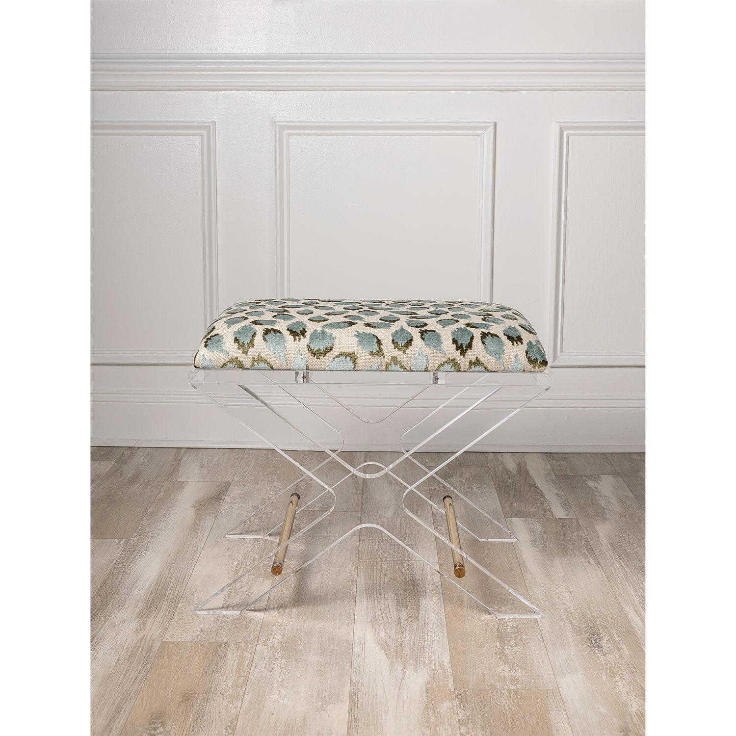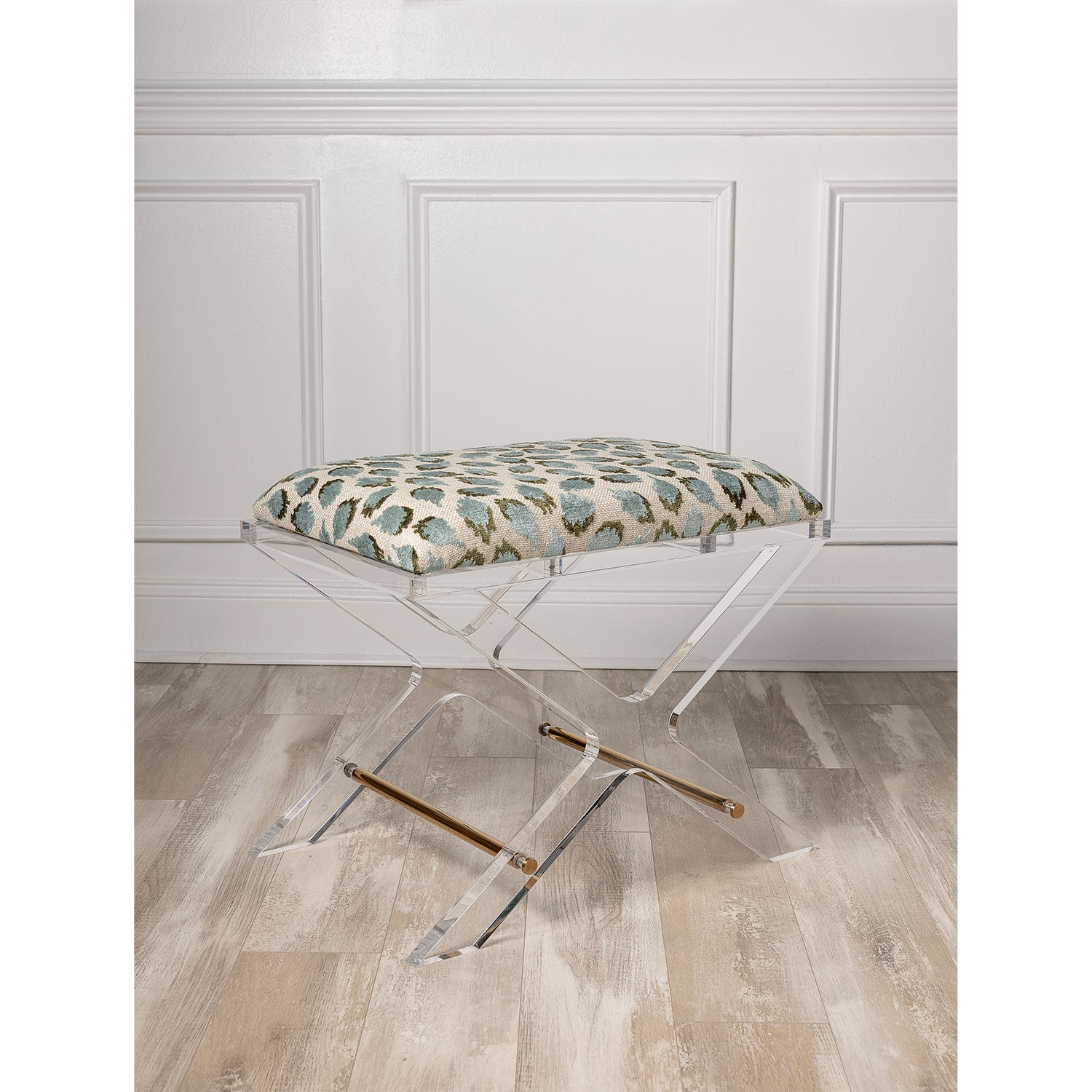 Uber chic clear lucite X shaped accent upholstery--our Delano Bench is the perfect vanity stool and/or designer accent bench in front of the cocktail table or console. Accented with polished gold stretcher bars.