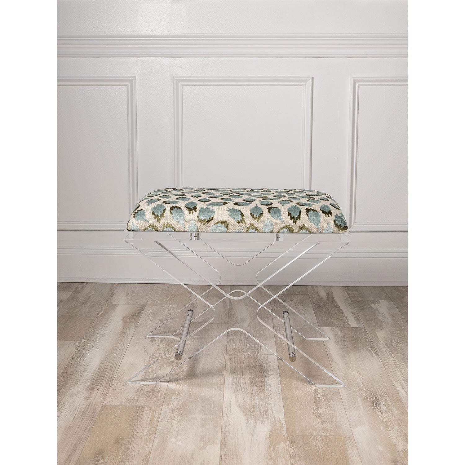 Uber chic clear lucite X shaped accent upholstery--our Delano Bench is the perfect vanity stool and/or designer accent bench in front of the cocktail table or console. Accented with polished nickel stretcher bars.