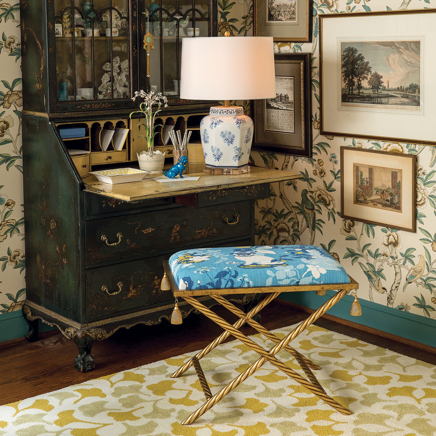 As you may know, the Madcap gents have 4 rescue pups--Jasper, Winnie, Cecil and Amy Petunia. We love that the collection includes a nod to them with the Manor Born Pug fabric which is upholstered on the Delfern Bench.