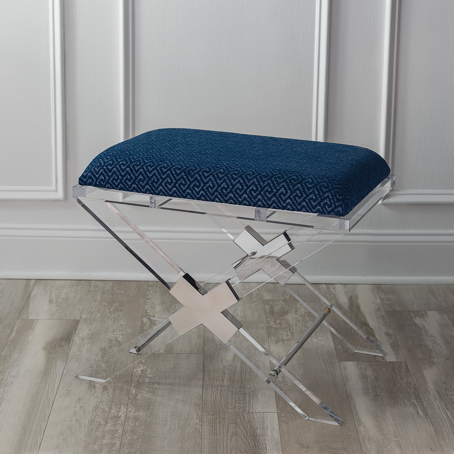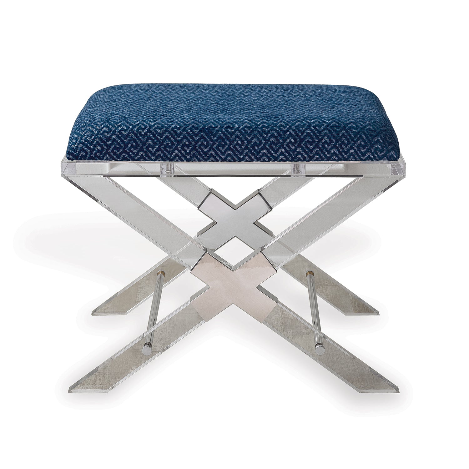 Uber chic clear lucite X shaped accent upholstery--our Crossing Bench is the perfect vanity stool and/or designer accent bench in front of the cocktail table or console. Accented with polished nickel stretcher bars.