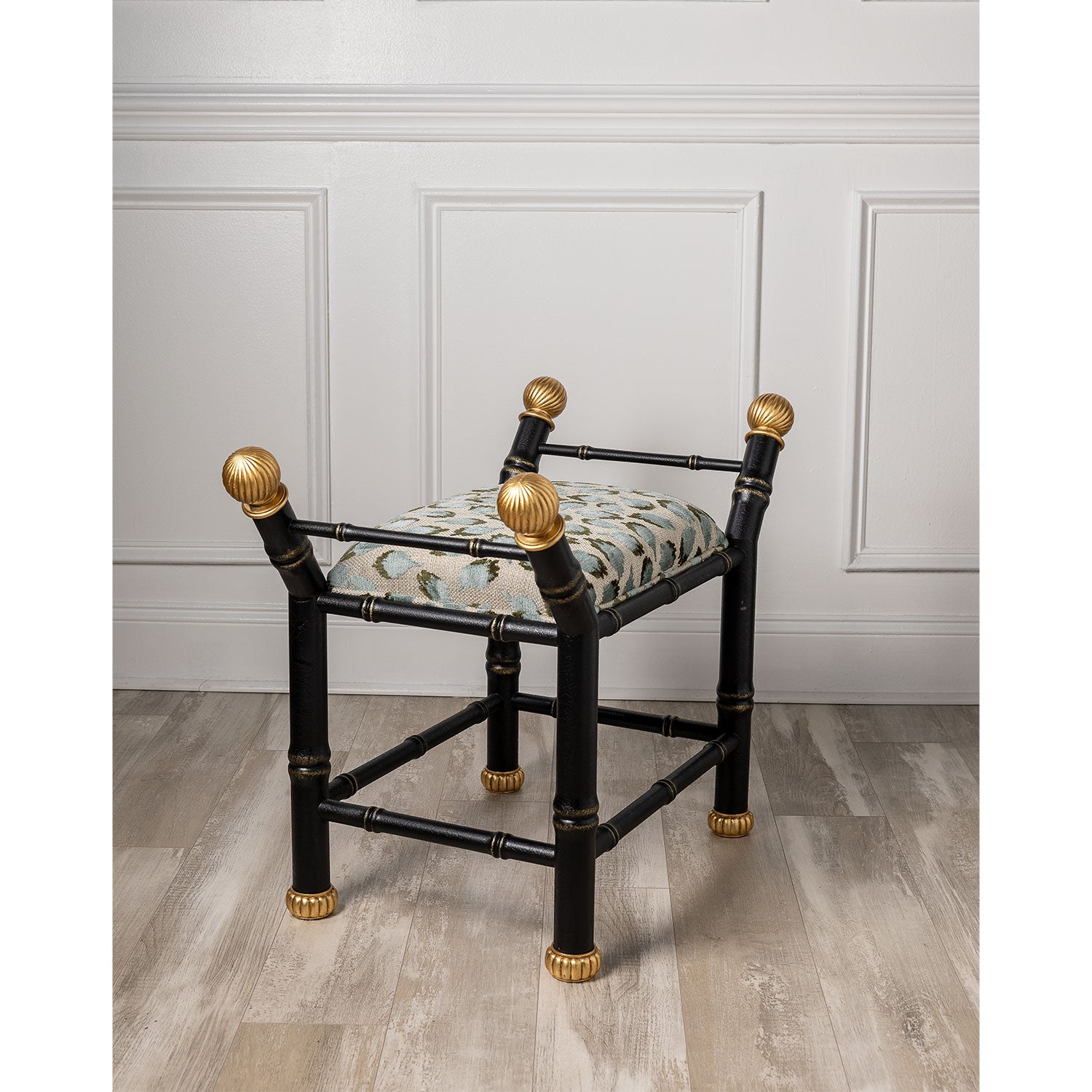 Boca is our hollywood regency style bench with features a bamboo frame and contrast metal gold leaf fluted finials and feet. Cast steel metal frame is available in black crackle and cream/white crackled finishes. We offer a range of fabrics.