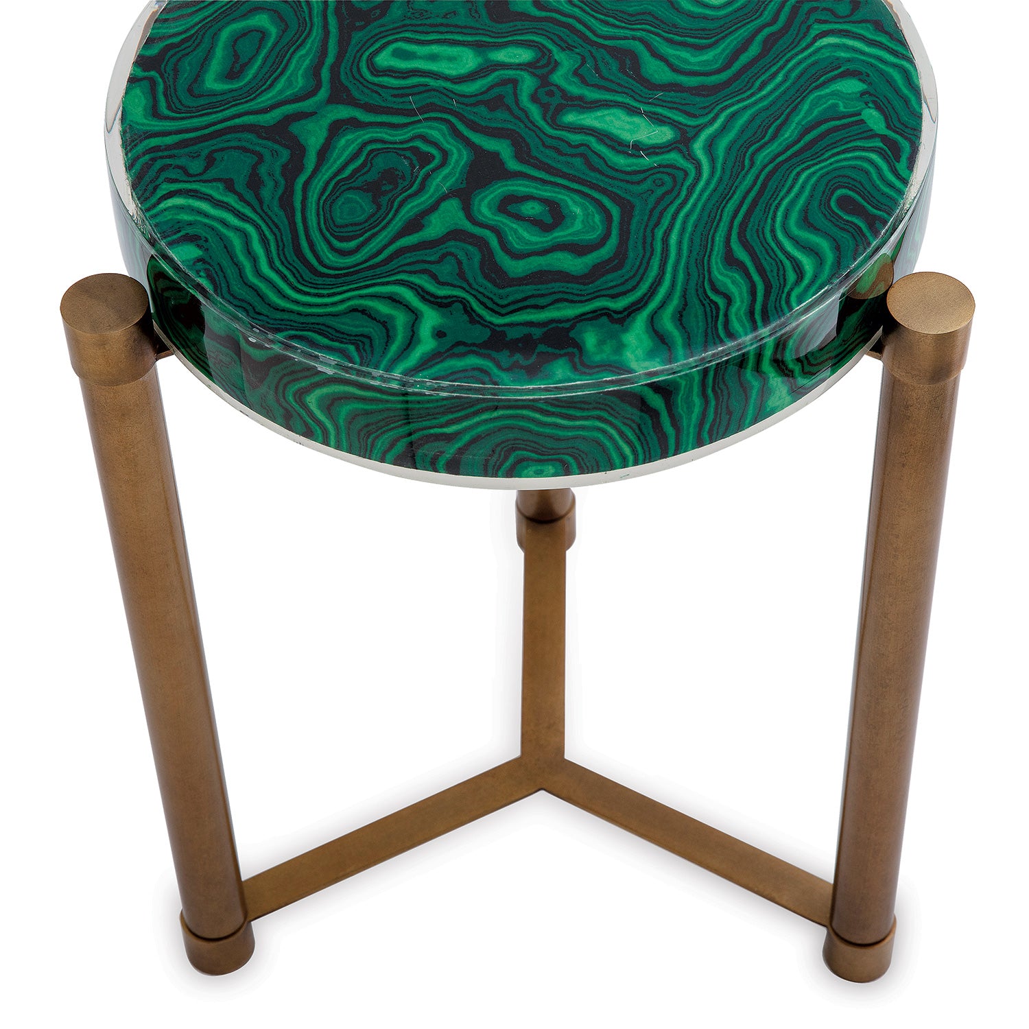 Dramatic green malachite and burnished aged brass is featured on our tri-leg round accent table. Scaled as a lamp or drink table between two chairs, or as a single drink table in front of the sofa. This round table has so many functions. The malachite pattern is made from paper that is cast in the round acrylic and wood top. Accented with aged brass legs and feet.