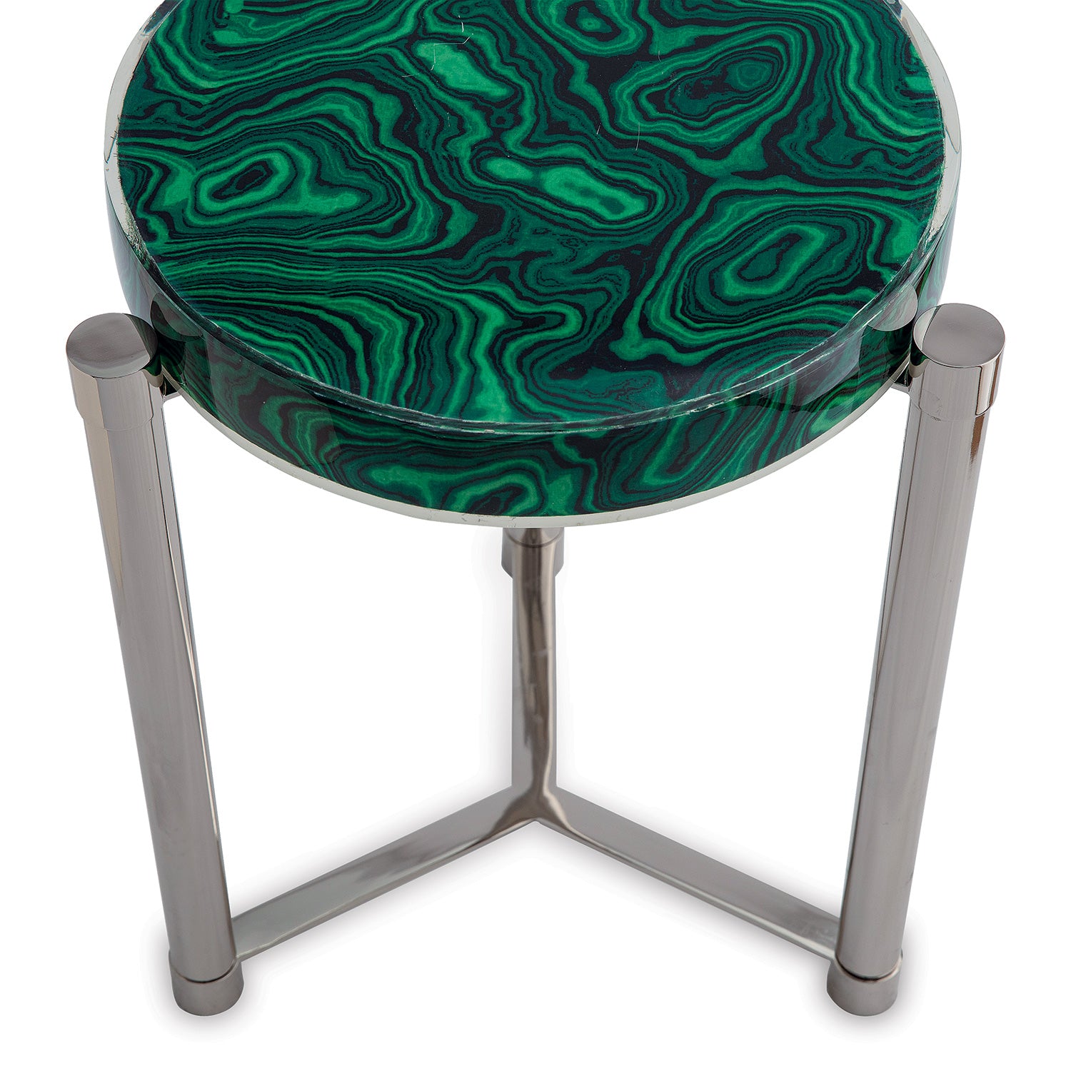 Dramatic green malachite and polished nickel is featured on our tri-leg round accent table. Scaled as a lamp or drink table between two chairs, or as a single drink table in front of the sofa. This round table has so many functions. The malachite pattern is made from paper that is cast in the round acrylic and wood top. Accented with polished nickel legs and feet.
