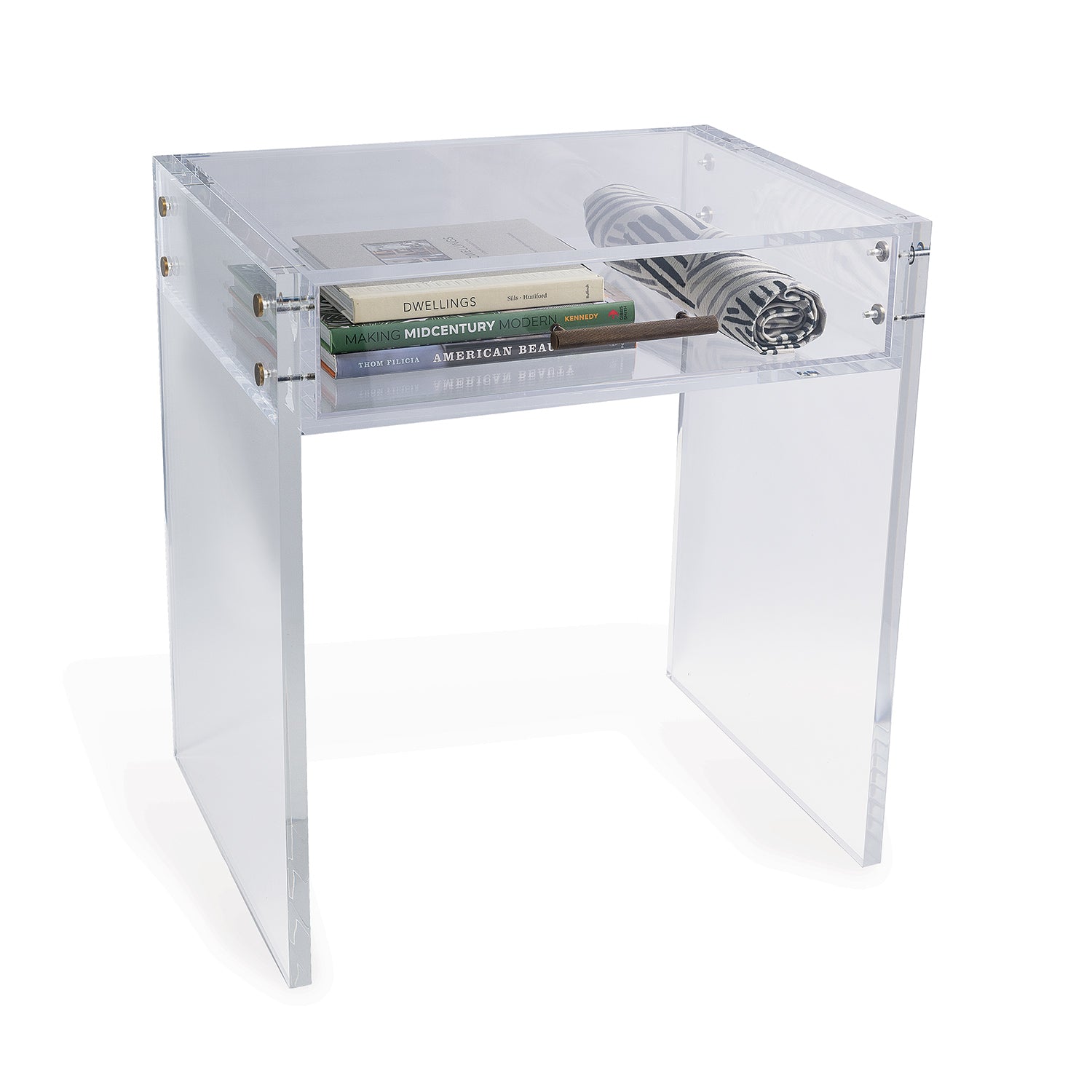 The end table features a clear pull out drawer accented with a knurled aged brass finished metal handle. The bonus + with the inside drawer on this table is that it may be removed and used as a separate "tray" on the coffee table or sideboard. When the drawer is closed and left in the end table, it offers display storage. As the table frame is clear, it offers a 'peak' into what may be inside the drawer when looking from above or the side.