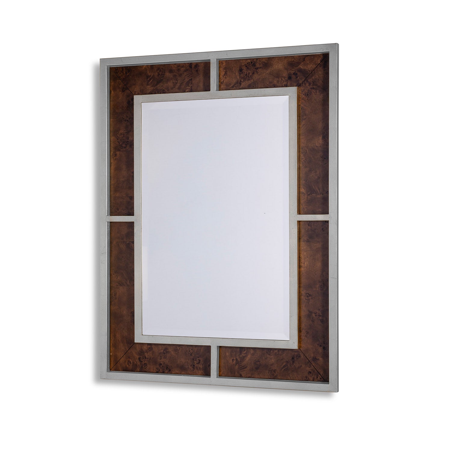Made from silver leaf finished metal frames, the Bedford mirror is shown in whiskey burl wood.