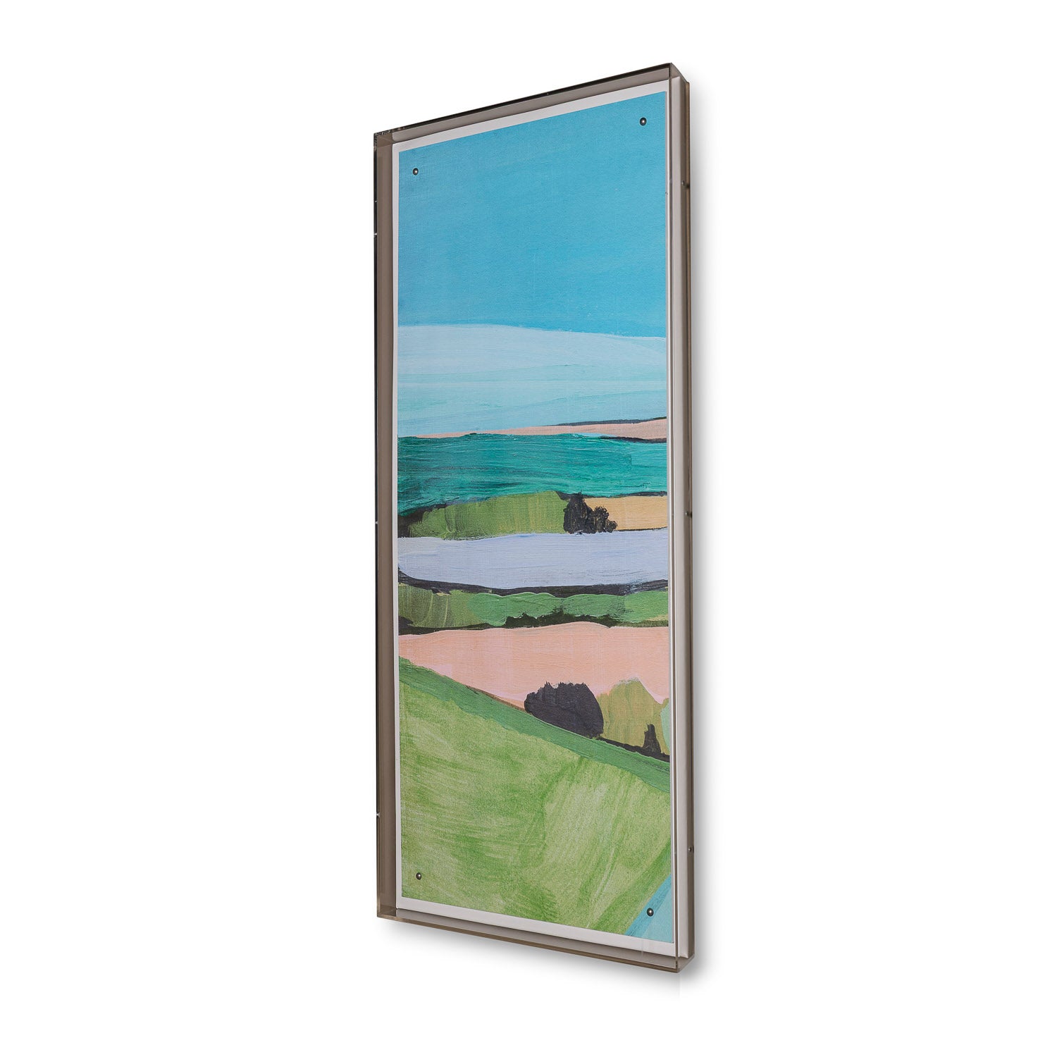 Our colorful countryside looking toward the water is an explosion of color with apple, turquoise and peachy pink. Striking as a single panel but ever more dramatic in your living or dining room when shown as a left/right pair.