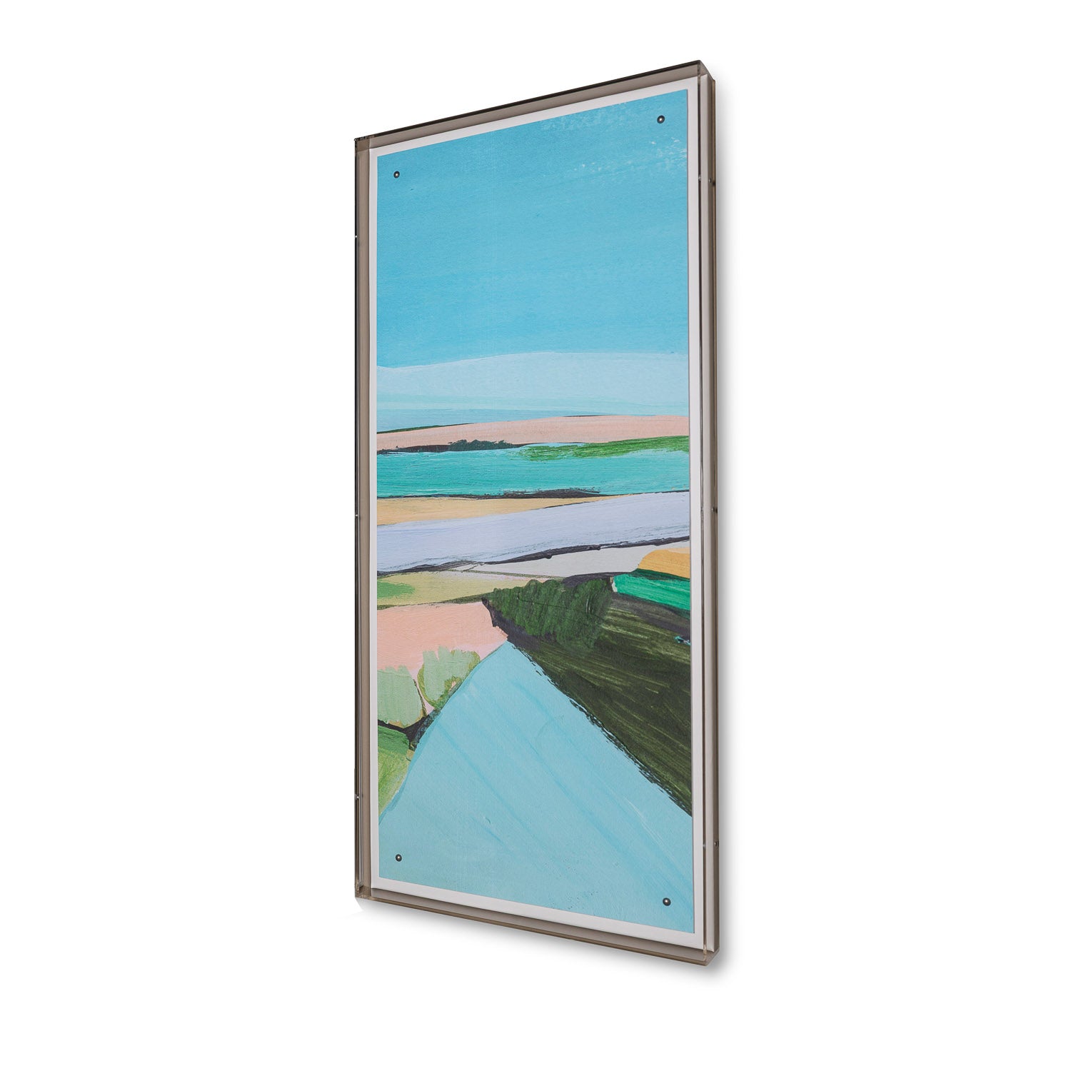 Our colorful countryside looking toward the water is an explosion of color with apple, turquoise and peachy pink. Striking as a single panel but ever more dramatic in your living or dining room when shown as a left/right pair.