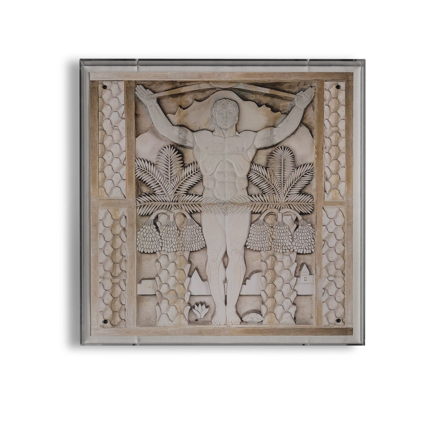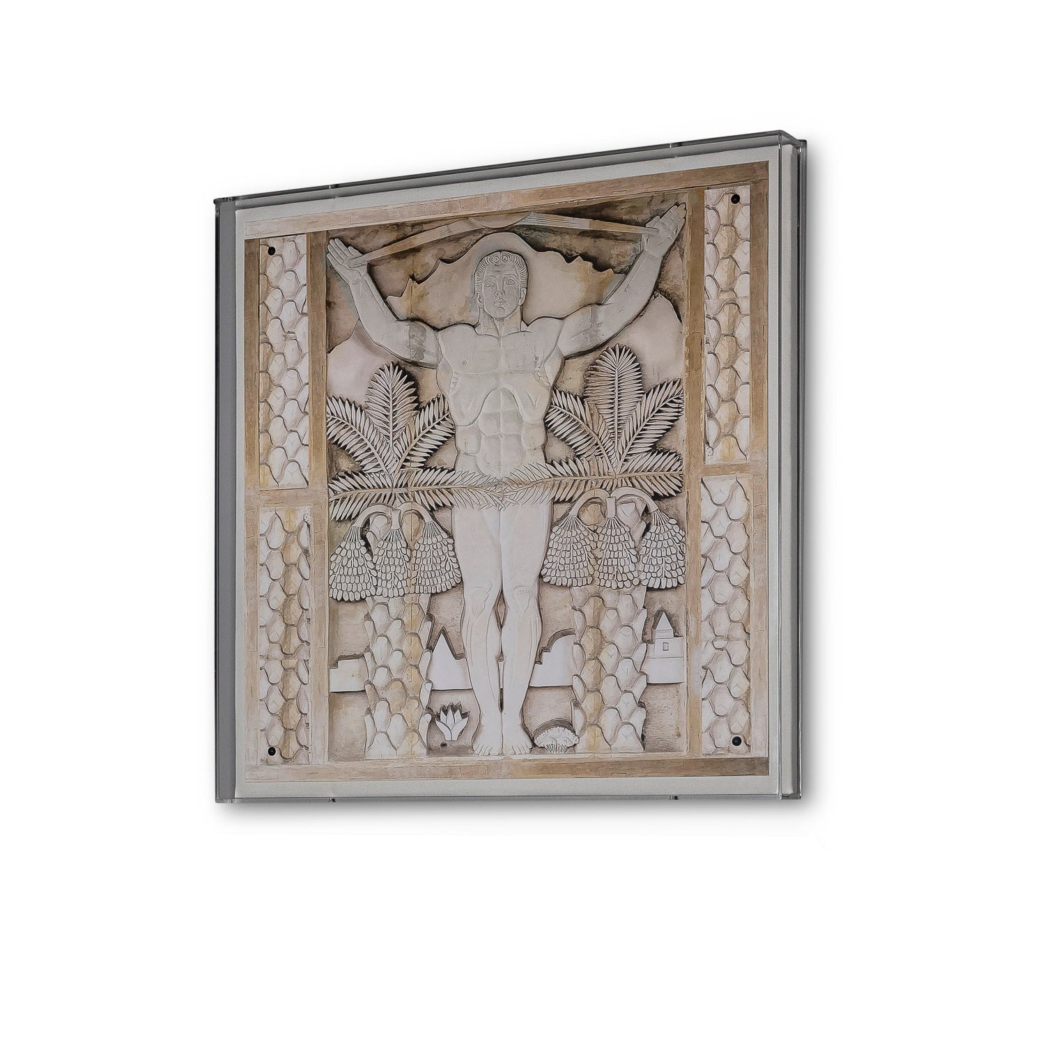 The desert prince artwork features a giclee print mounted under a 2.5" deep lucite shadow box. Attached to a linen wrapped interior panel, the artwork is finished with nickel nail head in each corner.