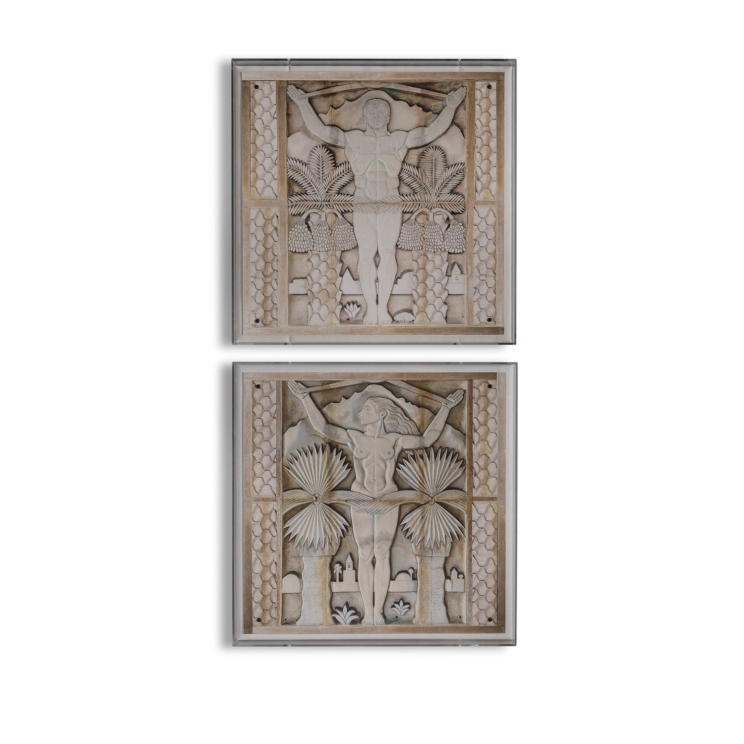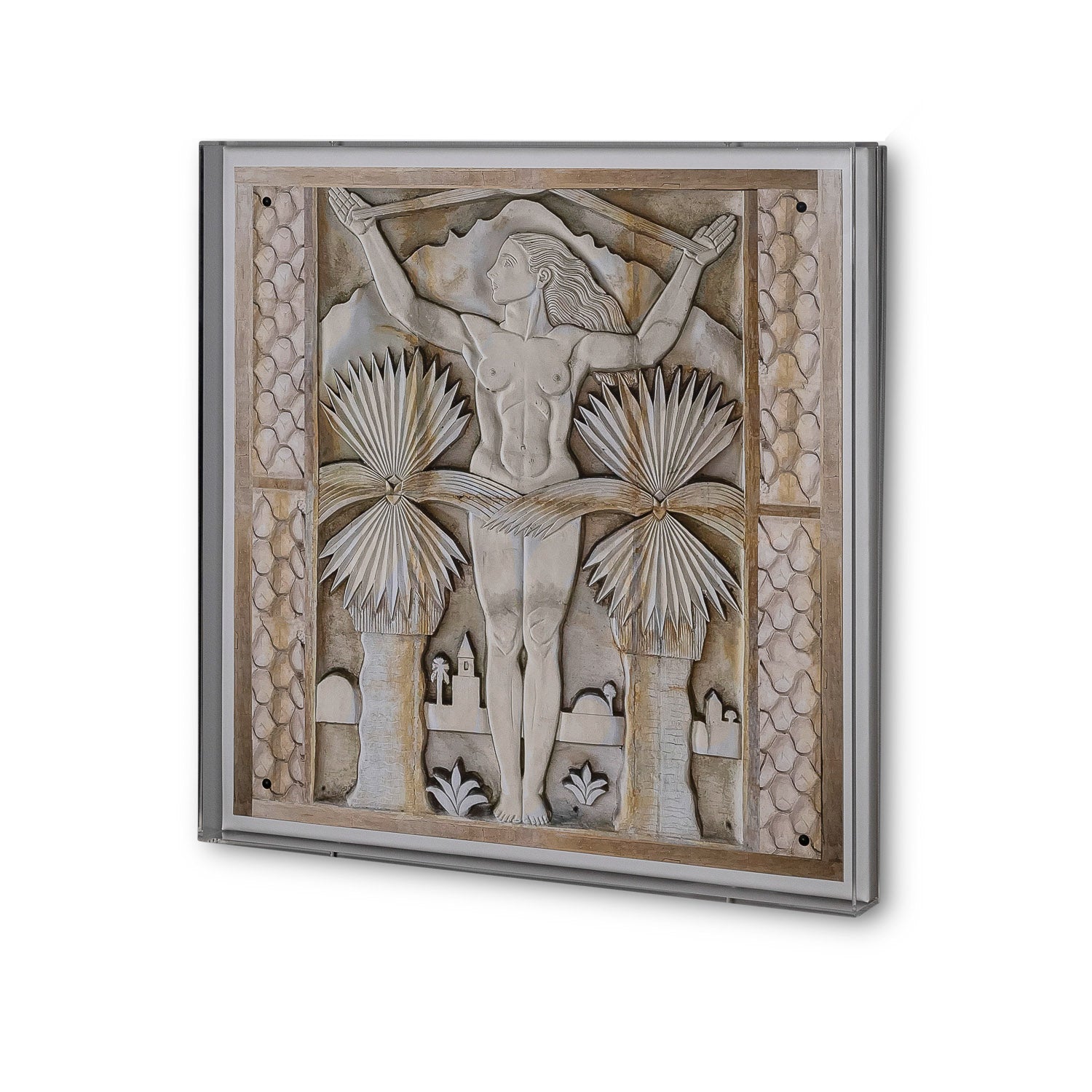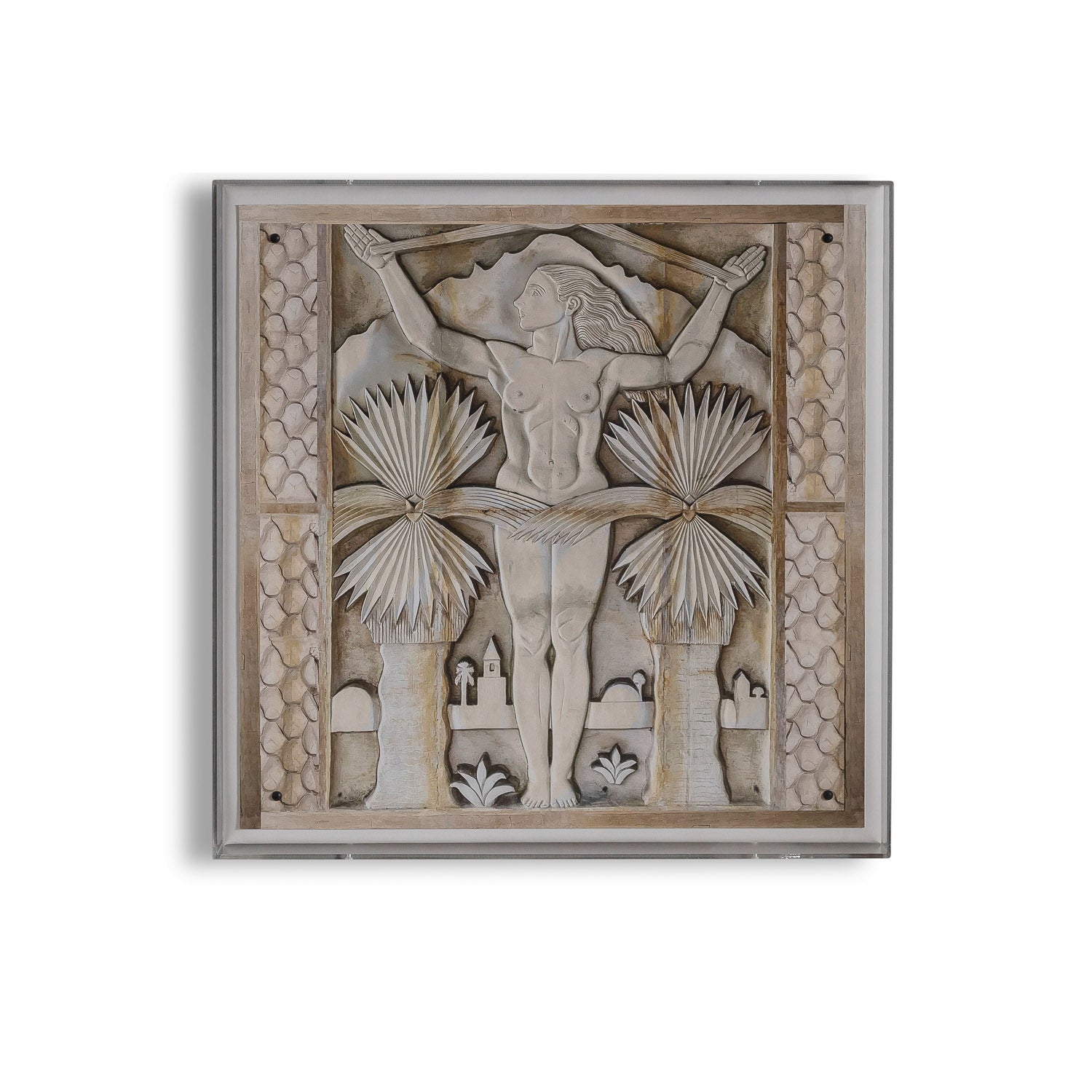 The desert princess artwork features a giclee print mounted under a 2.5" deep lucite shadow box. Attached to a linen wrapped interior panel, the artwork is finished with nickel nail head in each corner.