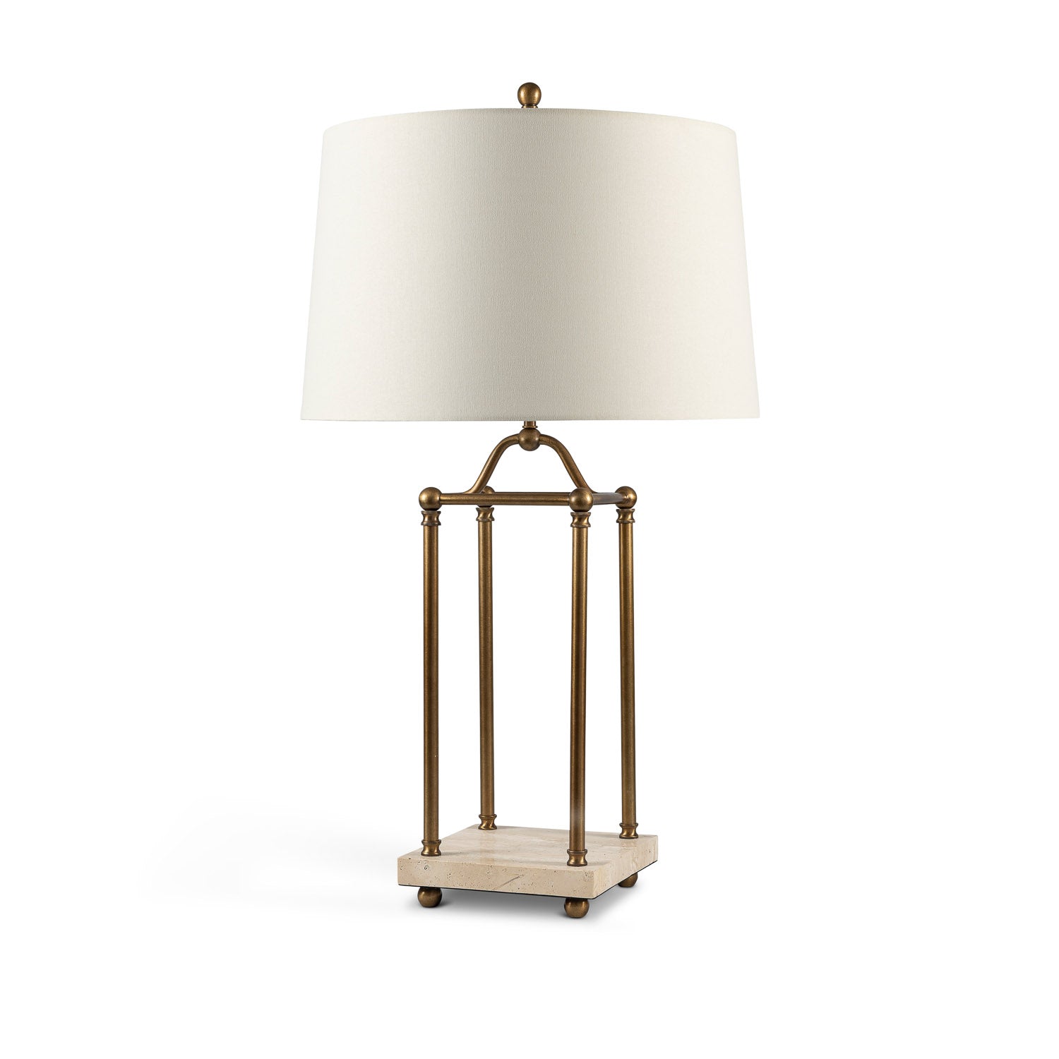 Architectural and classic comes to mind with our gazebo lamp. Designed so that you may feature a beloved objet or vase in the open stage of the lamp base; or just decorate your space with the clean column form of the gazebo shape lamp. So many personal choices. The natural travertine marble base is accented with aged brass finished metal ball feet and columns. Metal ball finial.