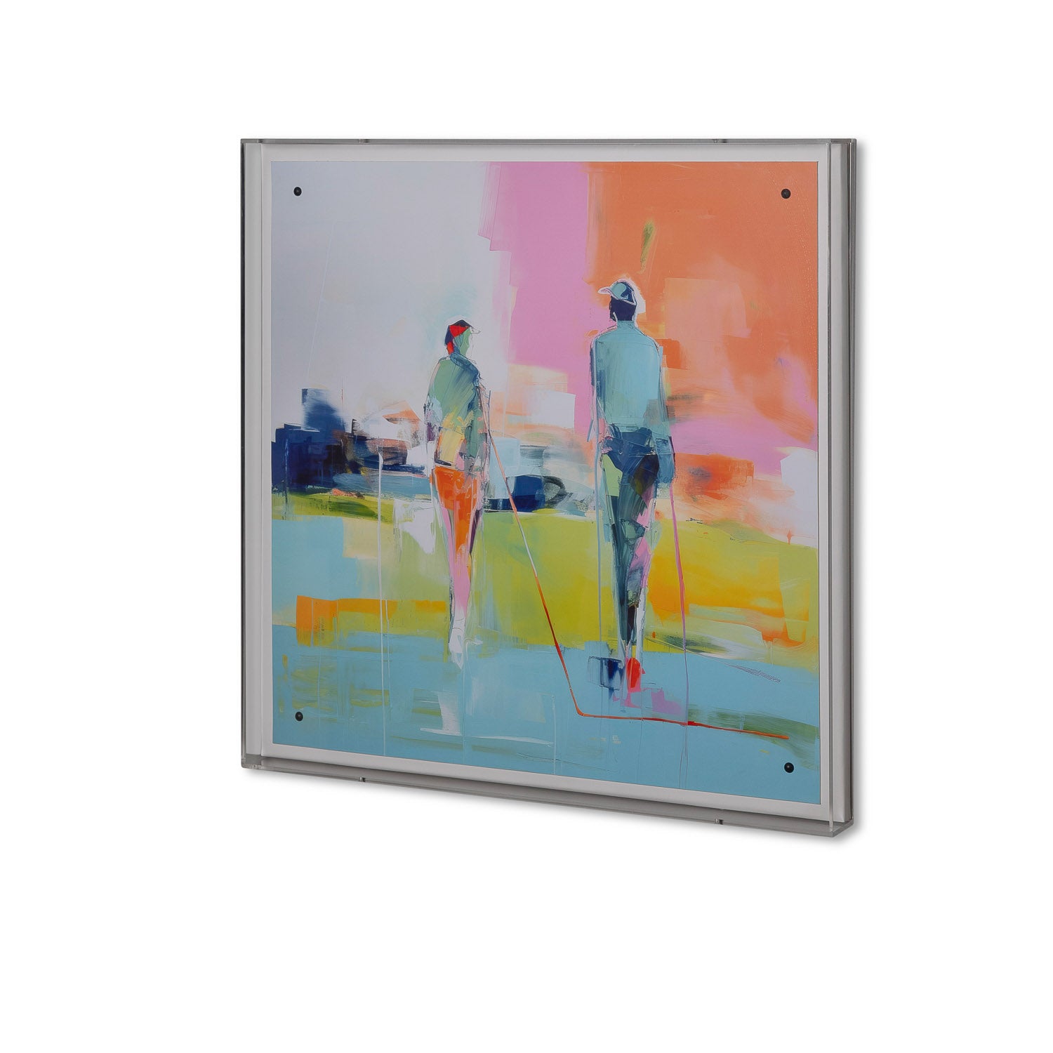 The Golf artwork features a giclee print mounted under a 2.5" deep lucite shadow box. Attached to a linen wrapped interior panel, the artwork is finished with black nail head in each corner.