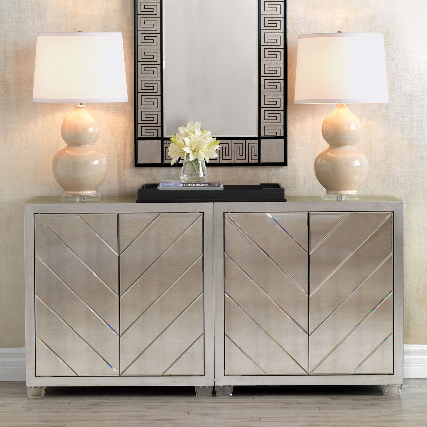 Our classic designer lamp, pearl is inspired by the color of a sea pearl. Designed with a lucite square base and nickel hardware, pearl has the appearance of cracked ice under glass. Metal ball finial.