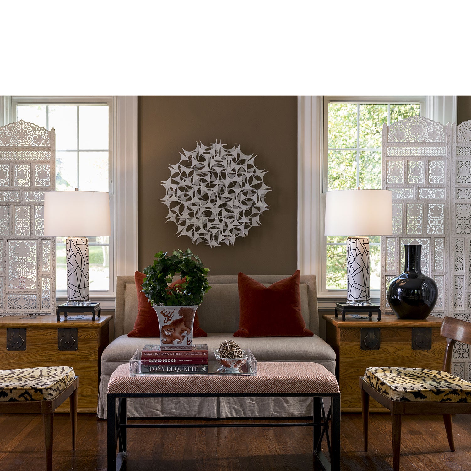 Graphix is our transitional modern lamp featuring a geometric cross-hatch pattern in black over a matte white porcelain lamp base. The Graphix pattern wraps around this clean, column style lamp base. Accented with brushed nickel hardware, the lamp features a cylinder shaped brushed nickel finial, and lucite round base.