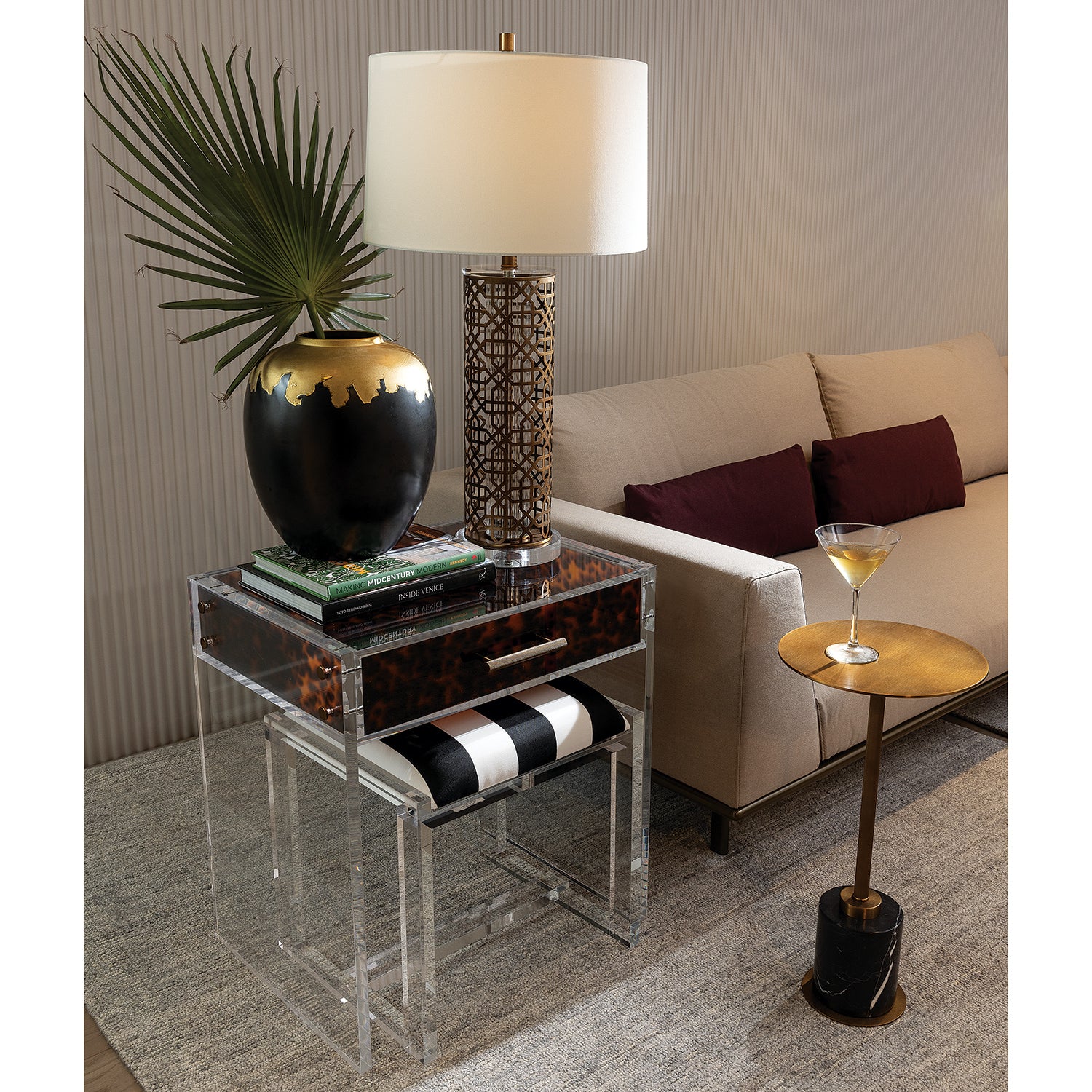 Luis is our modern column lamp which features a ribbed glass interior column and laser cut steel exterior column. The lamp is accented with a acrylic top cap and round base. We love how the lamp allows light to pass through the column. Metal cylinder finial.