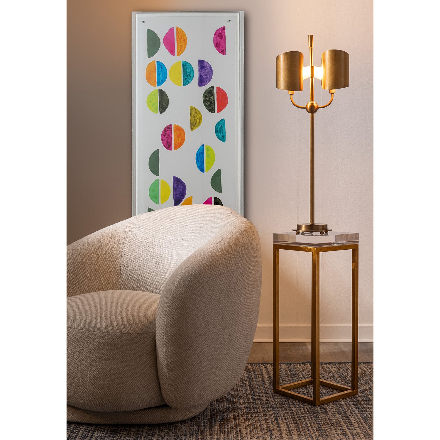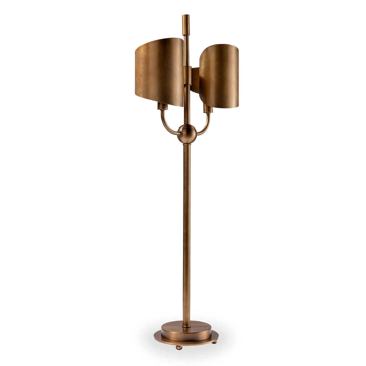 Our Quinton lamp is classic and undeniably modern with a deco nod. Featuring double sconces with hand curled metal shades, the shades reflect the light around the curves and the back.