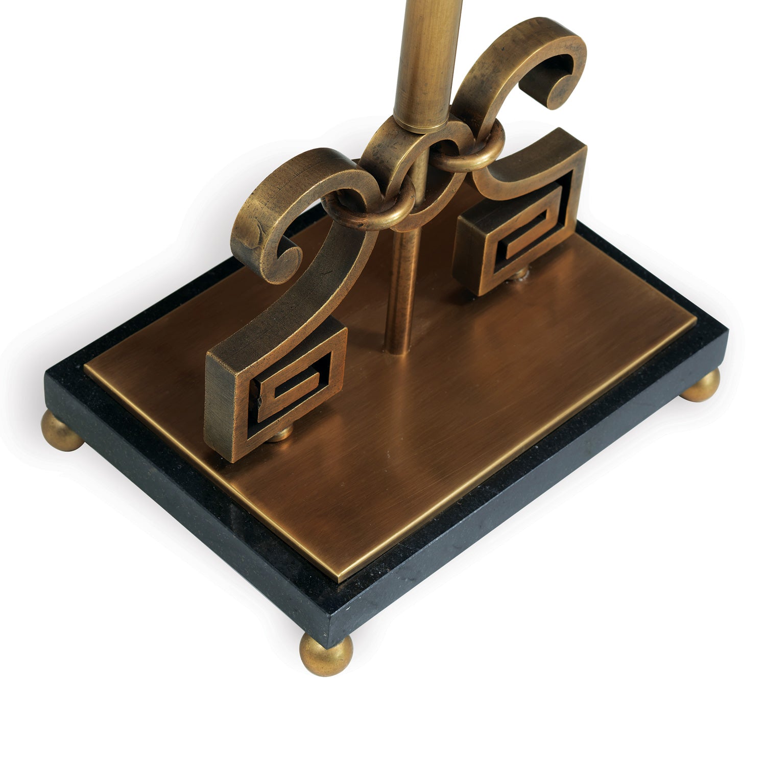 The greek key is featured on this wonderful floor lamp. With a base of speckled granite, and accents of aged brass, this floor lamp is a classic. Metal trumpet brass finial.
