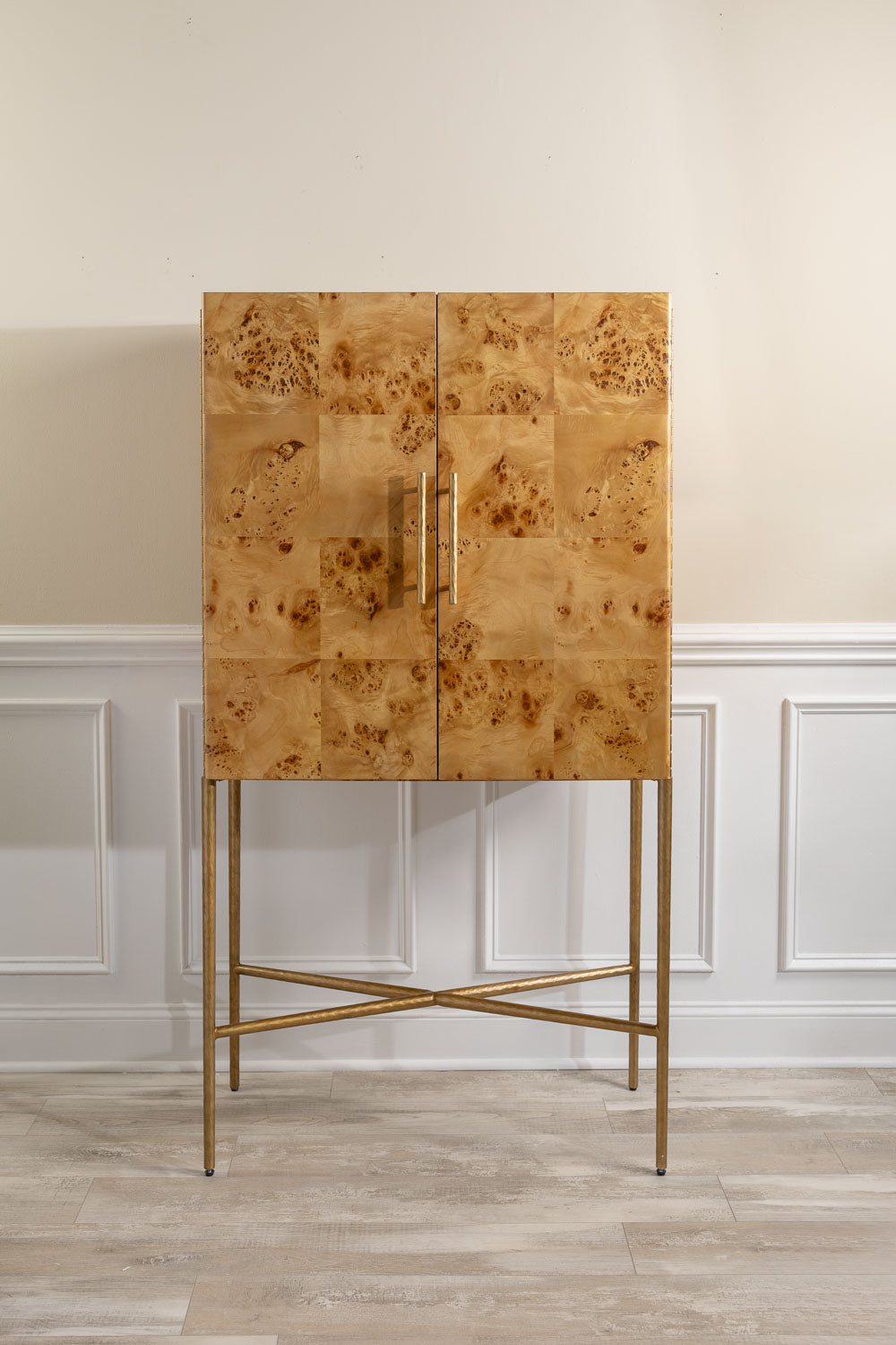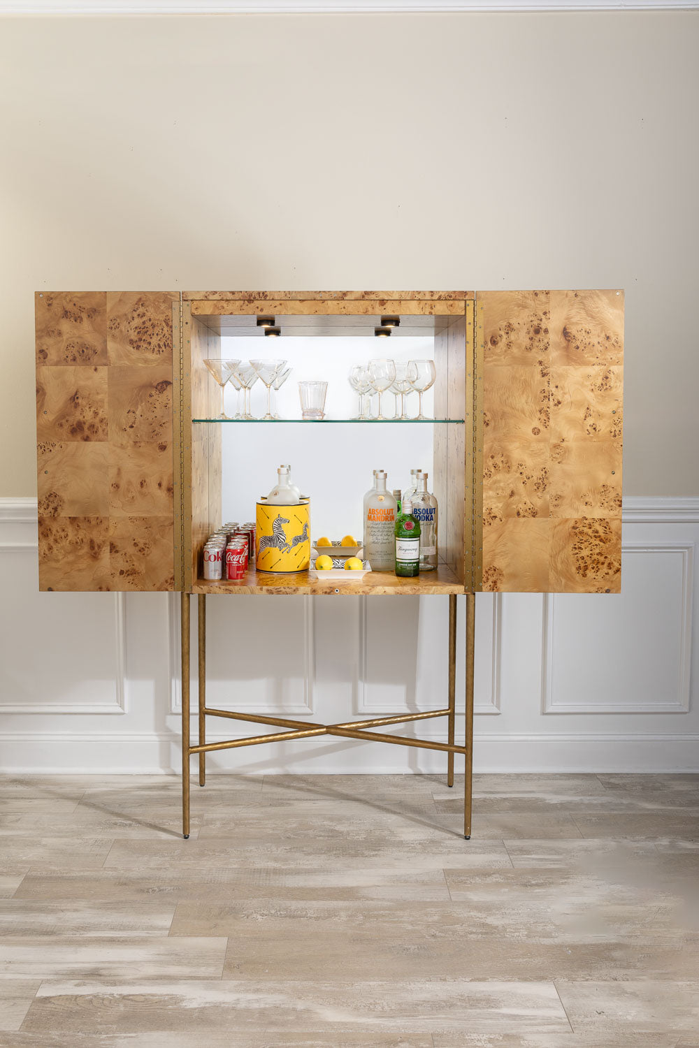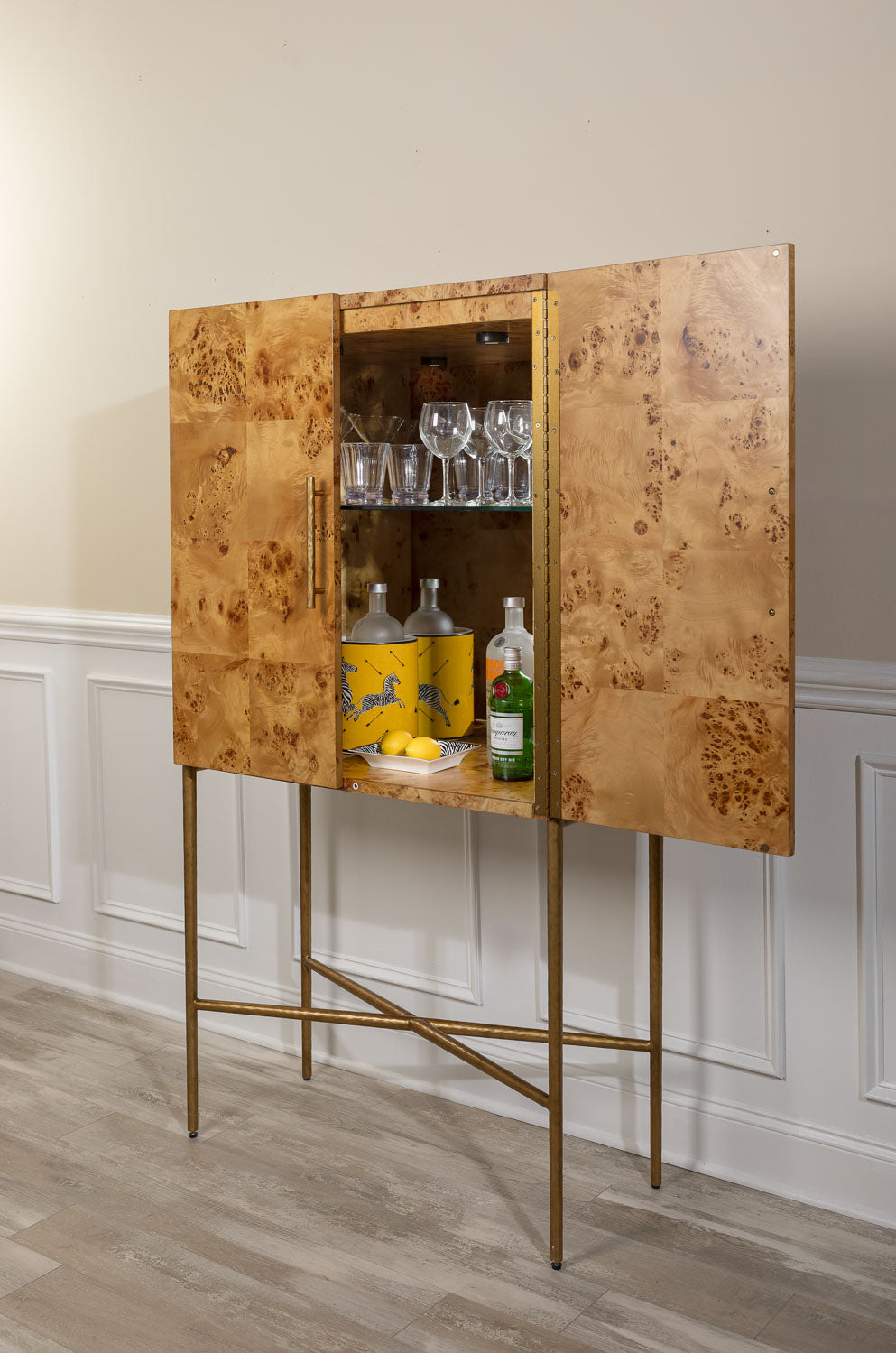 The monarch burlwood bar is the modern, yet classic room anchor for an evening of entertaining. With an adjustable interior glass shelf and mirror interior back, the bar offers function and organization for your assorted martini glasses and beverages.